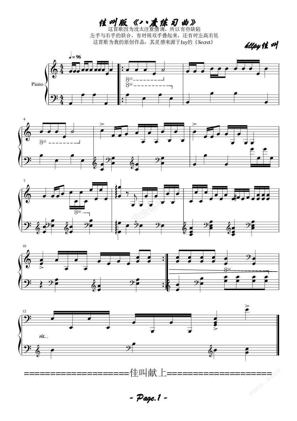 钢琴谱:佳叫版《简单八度练习曲》