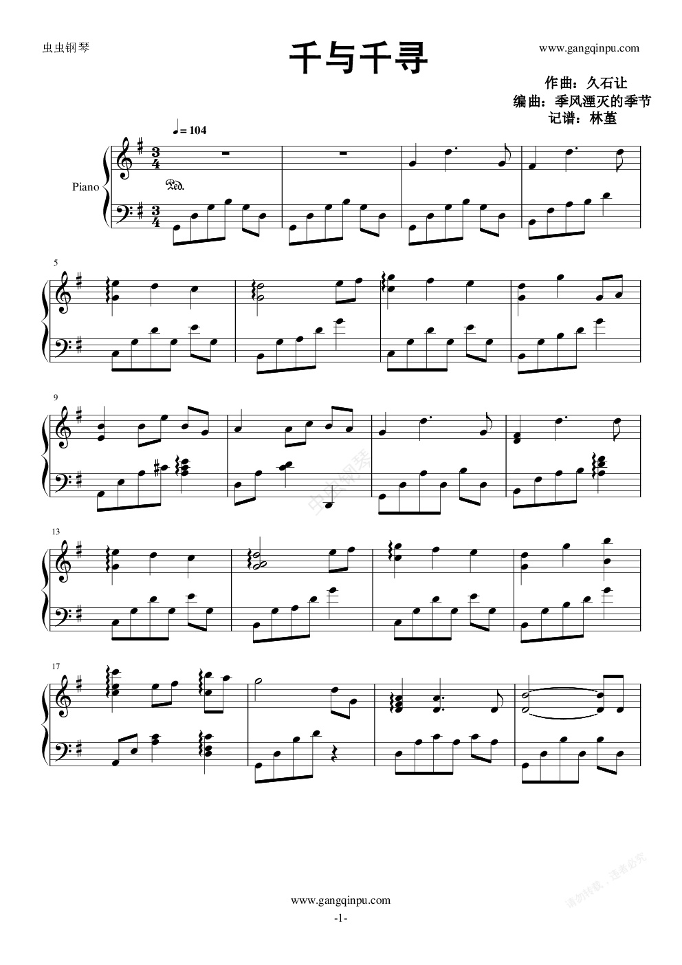 钢琴谱:千与千寻 完美独奏