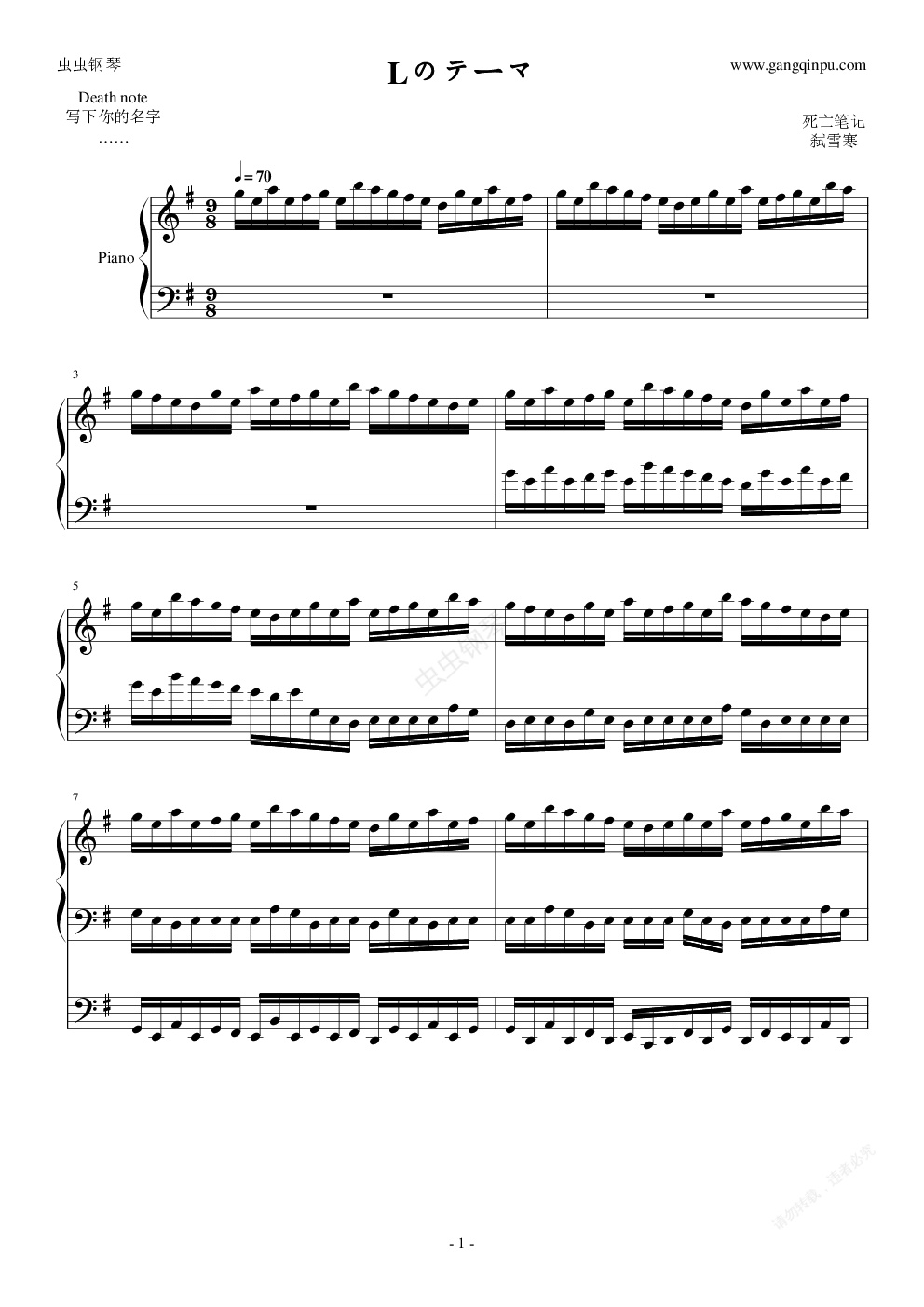 死亡笔记这部动漫早在2007(也许更早)就已经有了,还是高一的我就成了这部动漫的粉丝。就在该动漫将要掀起了一段热潮时,文化部以该动漫充满这血腥暴力之由,禁止该动漫在大陆播放,在接着该动漫的原音下载链接也渐渐无存,然而我依旧通过一些非法的网站,看完了这部动漫的动画版,电影版,以及电影版中的《L外传之最后的23天》,我还买了该动漫的周边产品,其中有该动漫的原音集CD,我一直希望能把它们弹下来,我盯了虫钢四年,确依旧没有人上传相关的曲谱(也有可能是自己一直没搜到)。四年过去了,我经历了高三,经历了高考的失败,经历了高复,现大一的我依旧没有在虫钢看到有关的曲谱,我在17号决定扒下这首《死亡笔记》的插曲《Lのテーマ》,其中17号到18号没吃没喝没睡连续弄了12个小时,听音乐都快听了耳聋耳鸣了,20就要回学校了,不过还是在19号晚上扒完谱,这让我还是挺高兴的。