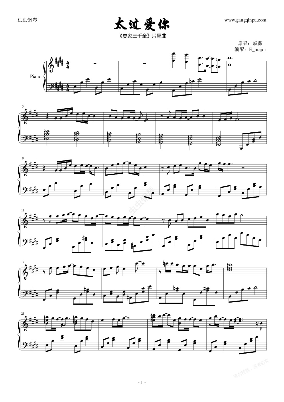 钢琴谱:太过爱你(《夏家三千金》片尾曲)