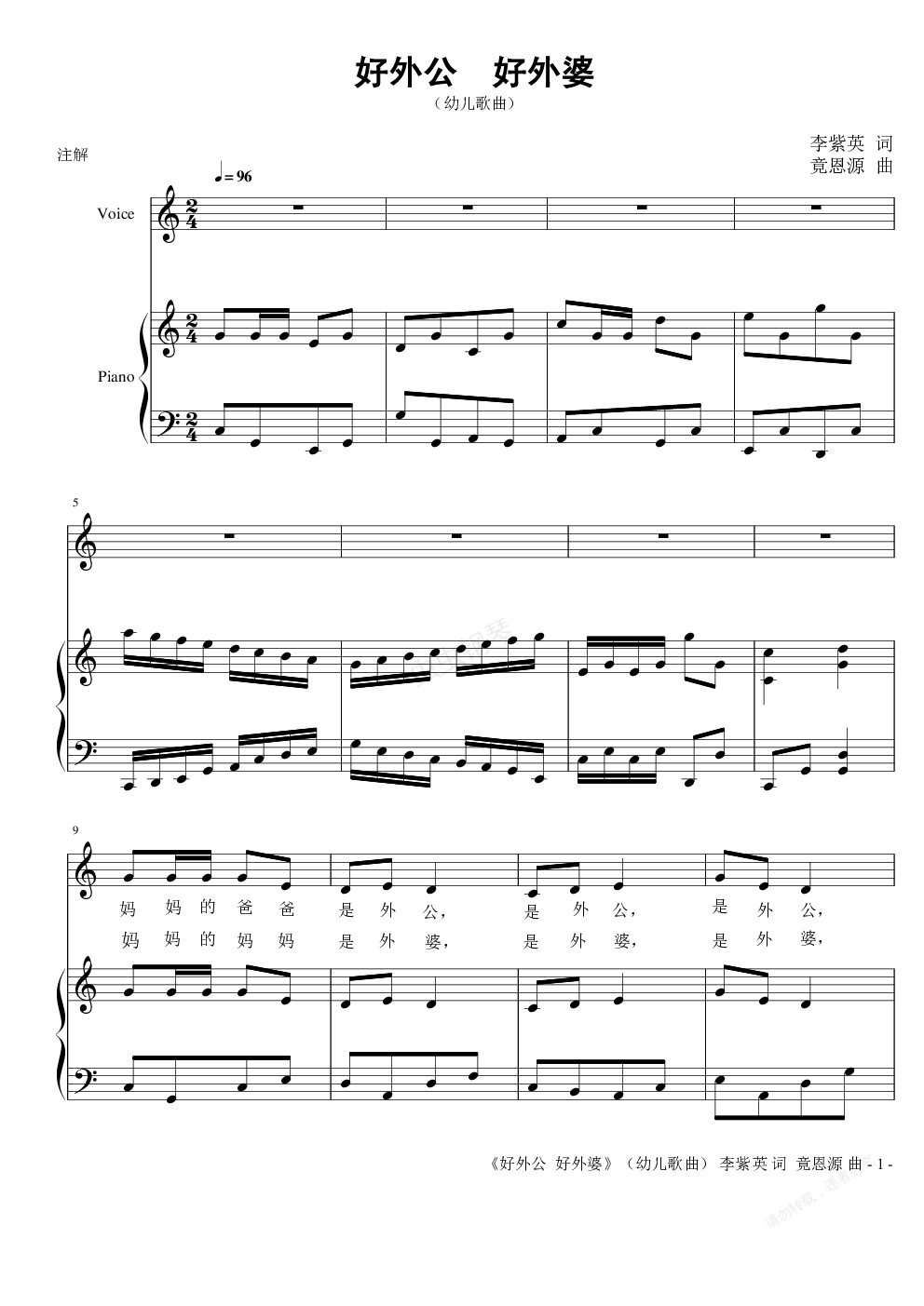 钢琴谱:《好外公、好外婆》(幼儿歌曲)李紫英词 竟恩源曲