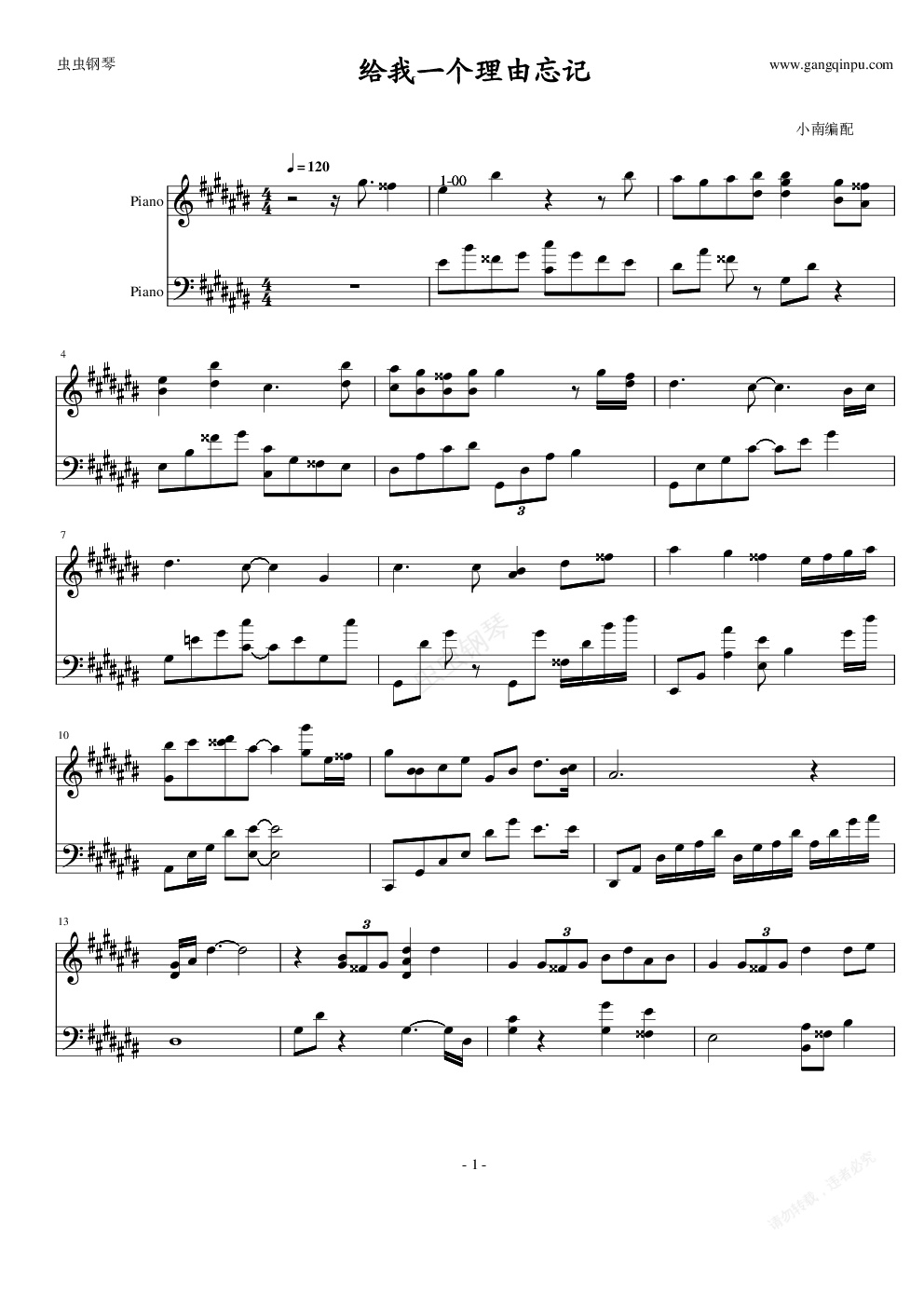钢琴谱:给我一个理由忘记