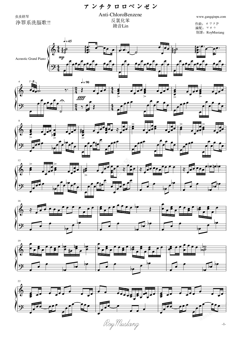 钢琴谱:[鏡音Rin]反氯化苯(浄罪系洗脳歌)