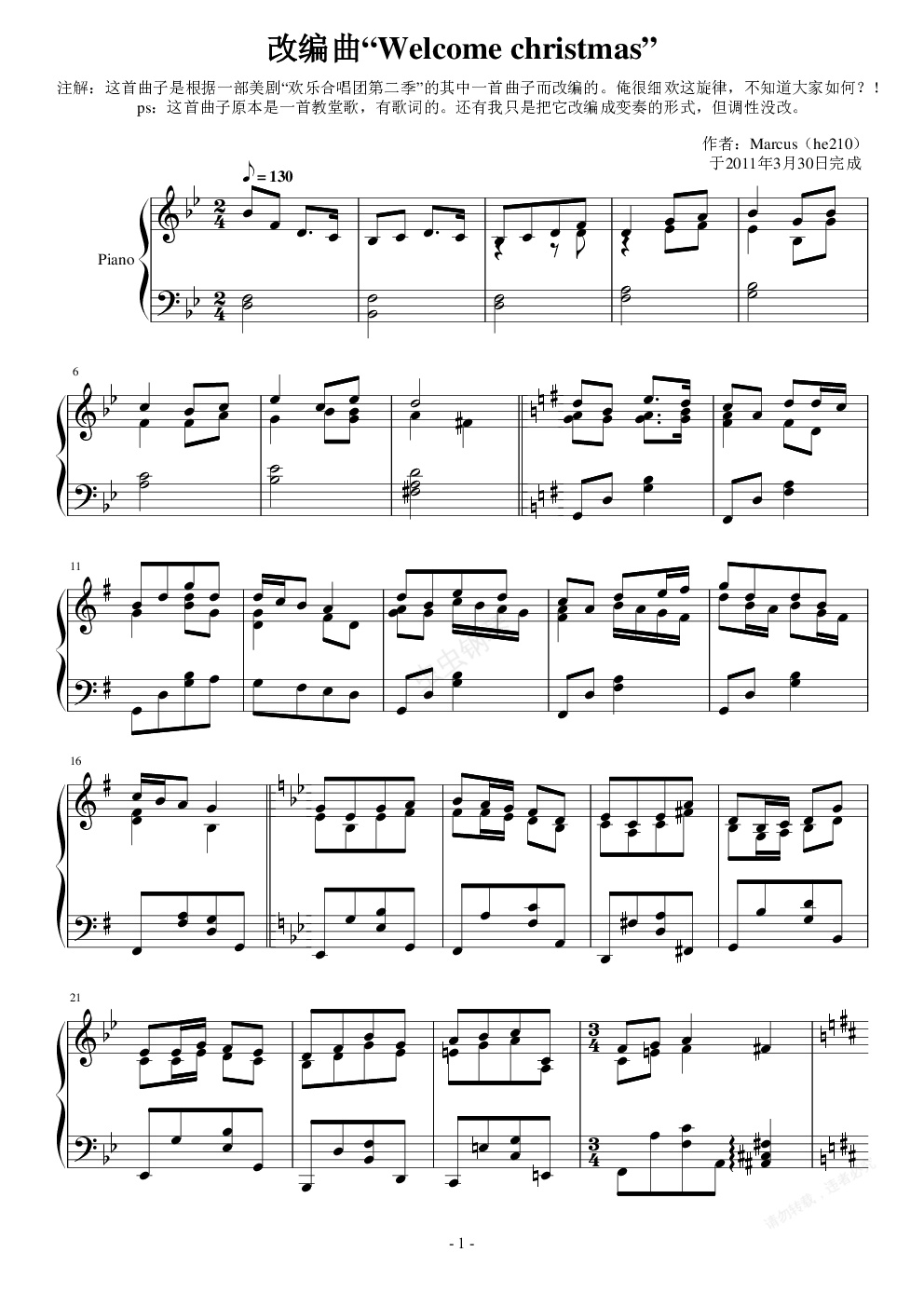 钢琴谱:改编曲“Welcome christmas”