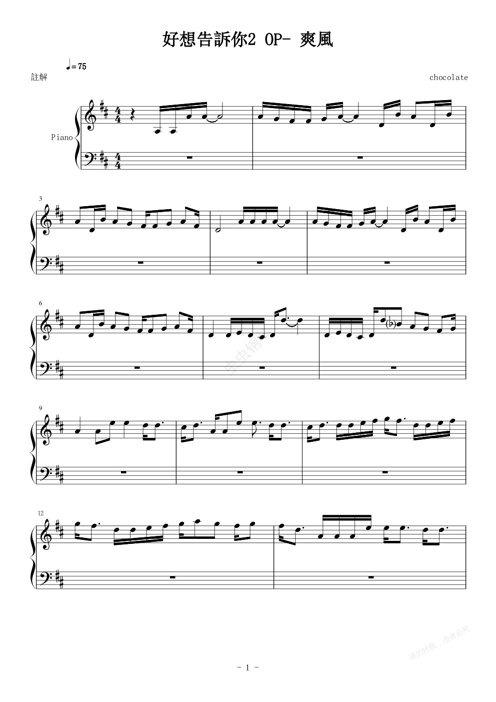 钢琴谱:好想告诉你(君に届け)Season2 OP- 爽风(单手版)