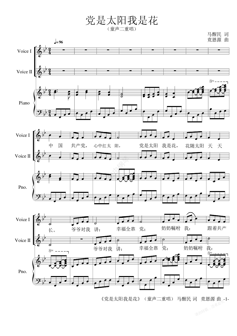 钢琴谱:《党是太阳我是花》(童声二重唱)马醒民 词 竟恩源 曲