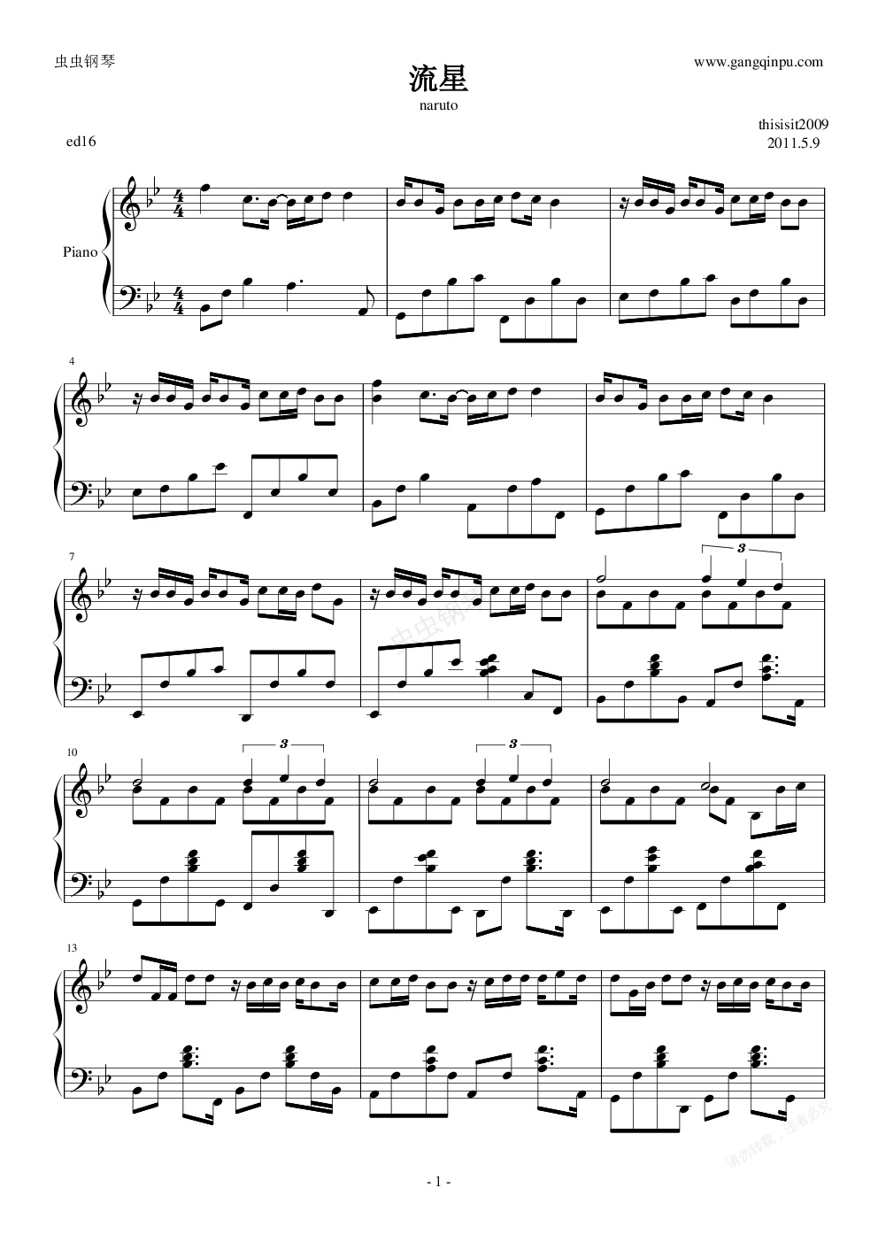 钢琴谱:【】火影忍者主题曲 ed16流星 独奏版