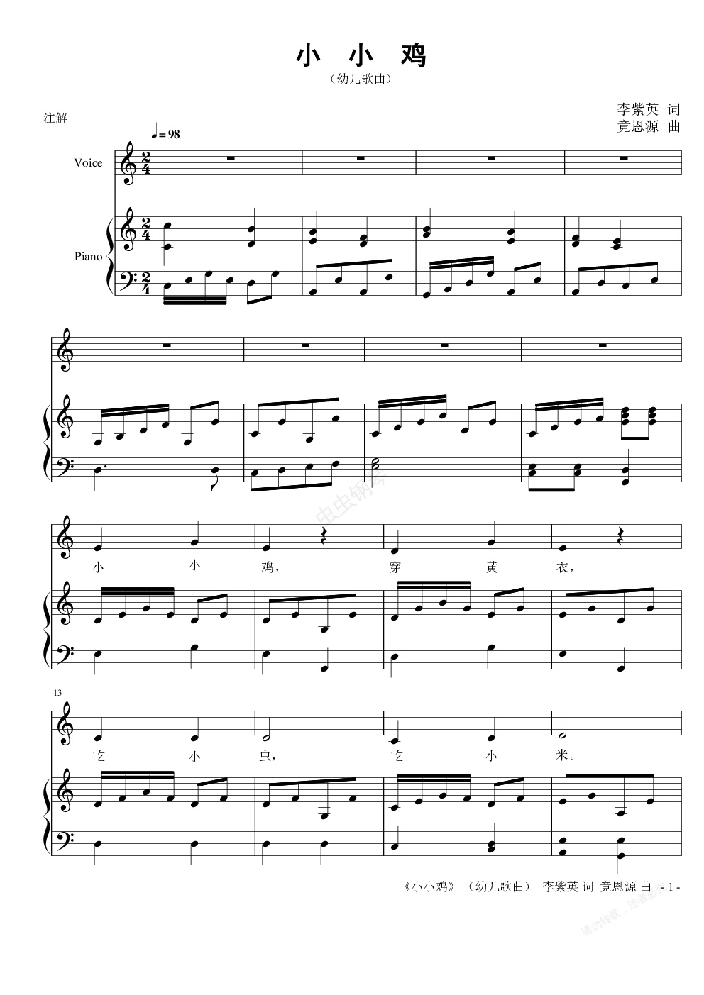 钢琴谱:《小小鸡》(幼儿歌曲) 李紫英 词 竟恩源 曲