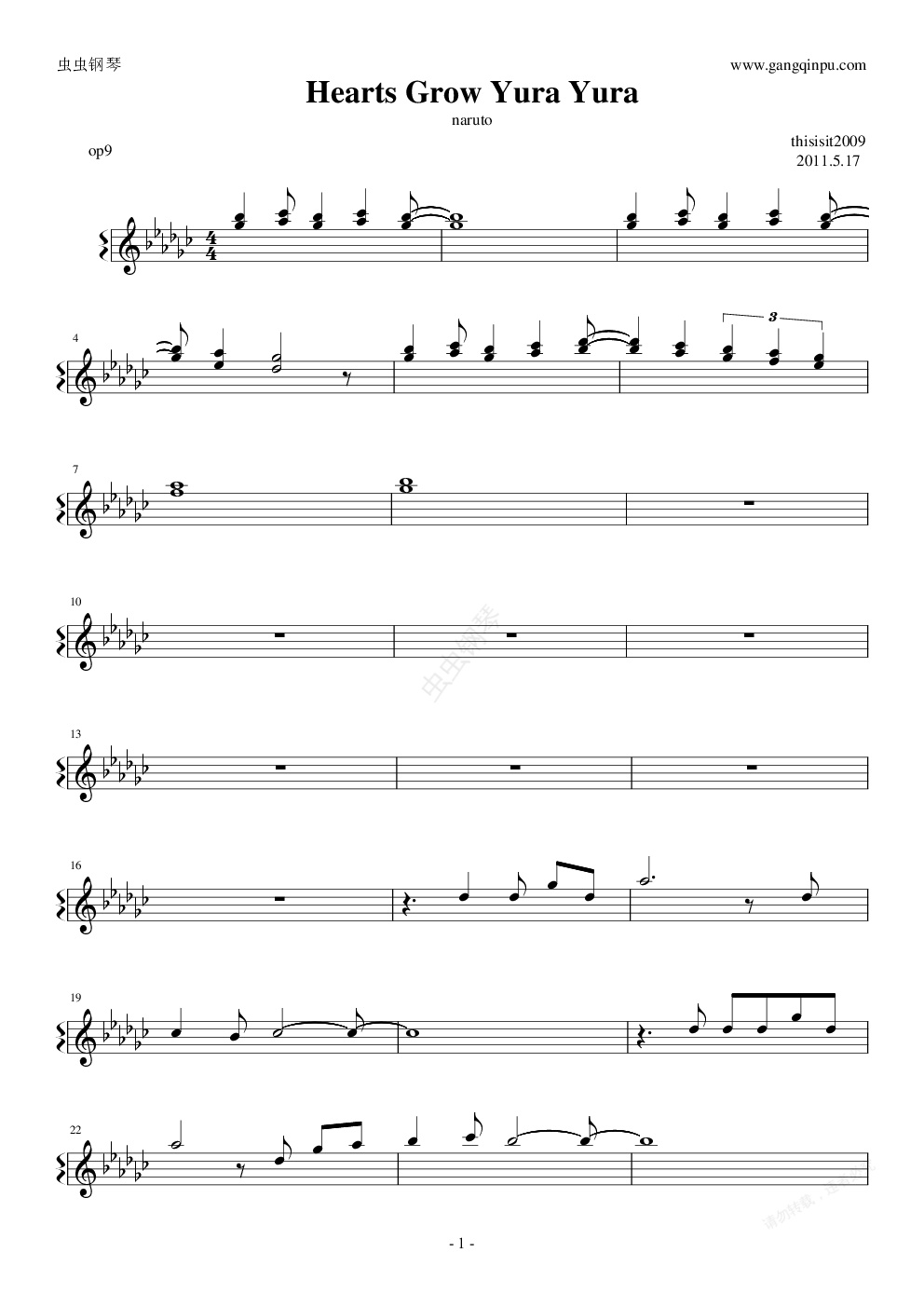 钢琴谱:【】火影忍者主题曲hearts grow yura yura op9