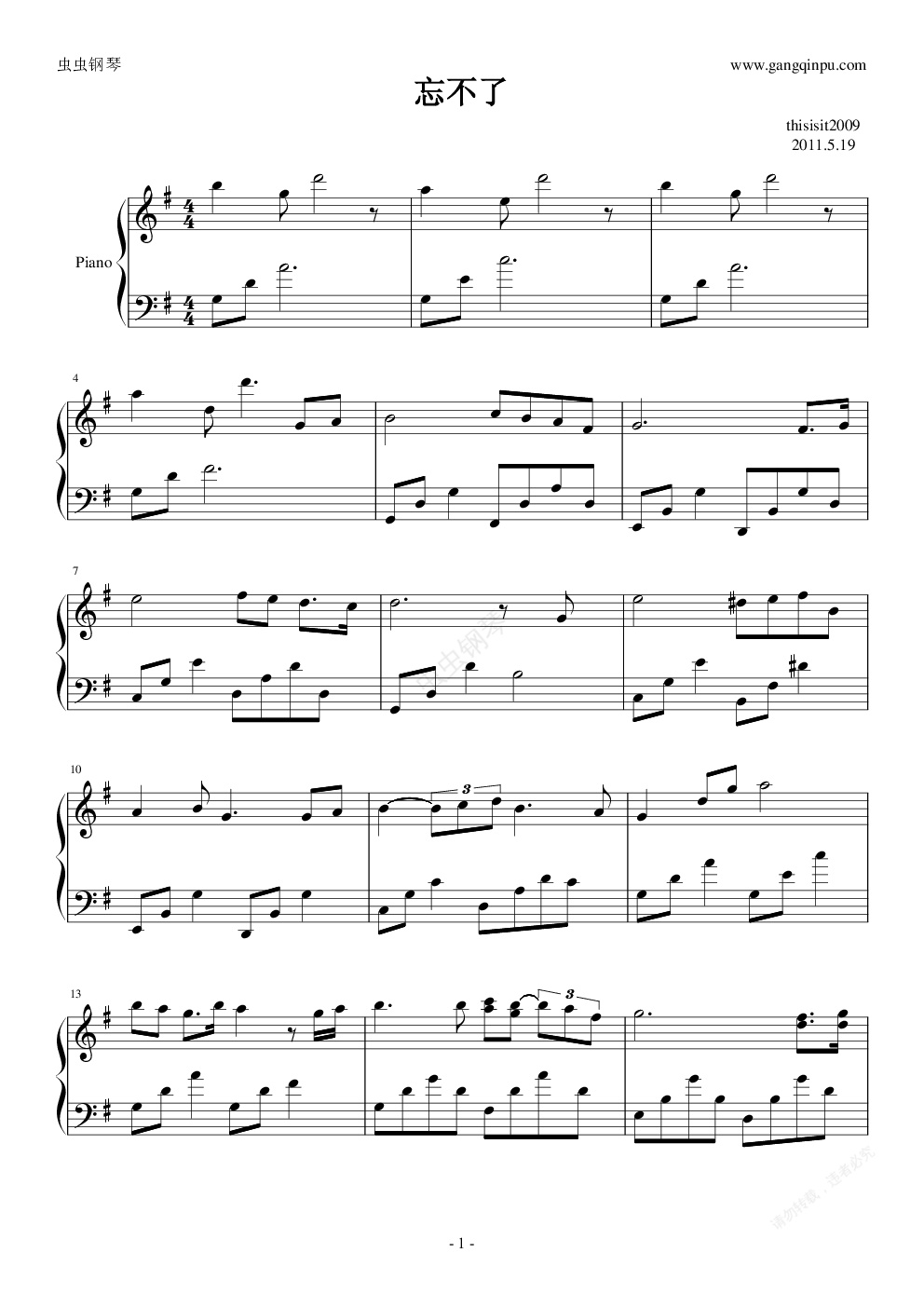 钢琴谱:忘不了电影插曲,很感人的一首曲子