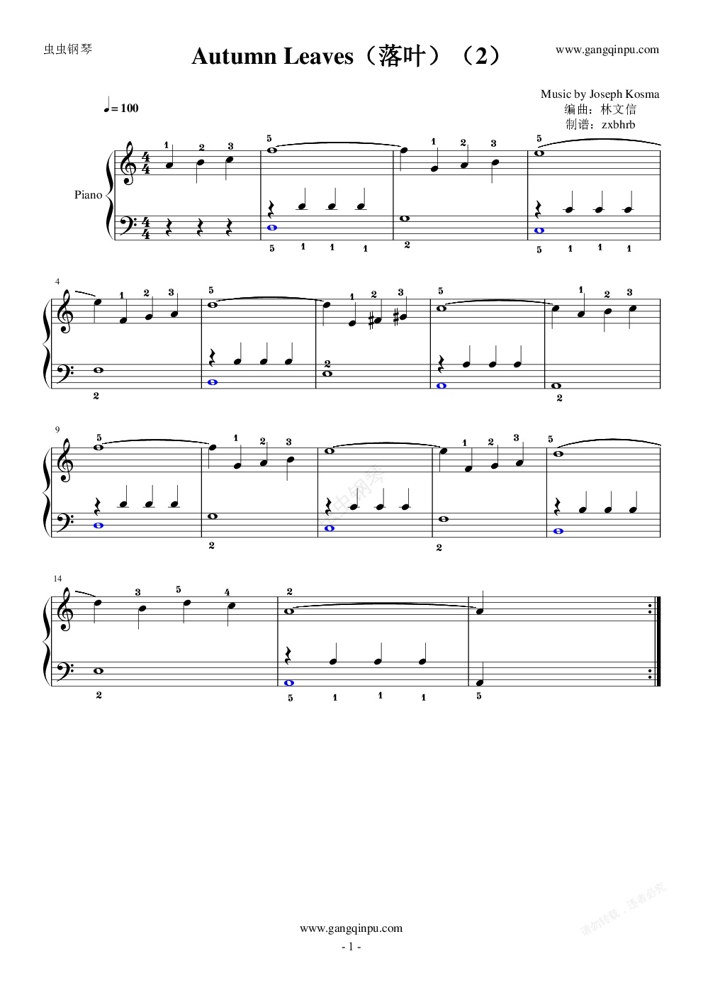 钢琴谱:《Autumn Leaves(落叶)(2)》-指法