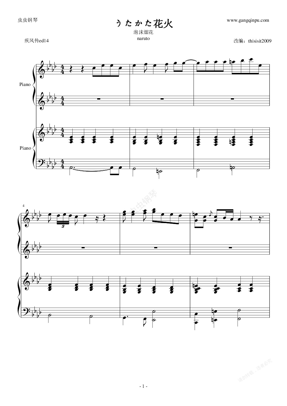 钢琴谱:【】火影忍者 泡沫烟花 华丽丽的四手联弹