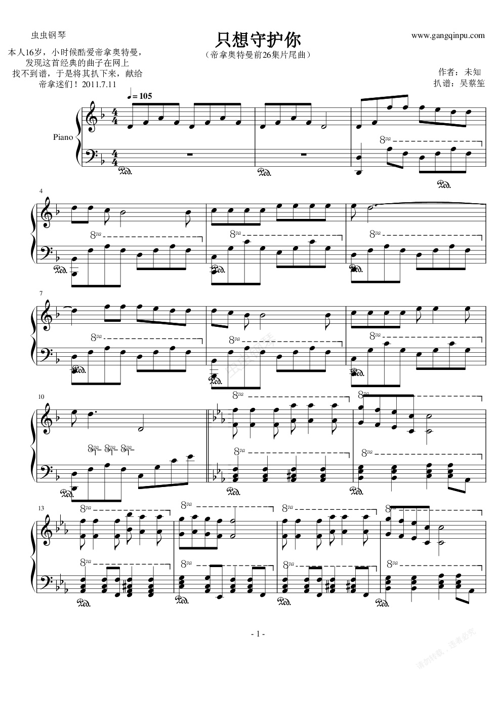 钢琴谱:只想守护你(帝拿奥特曼前26即片尾曲)