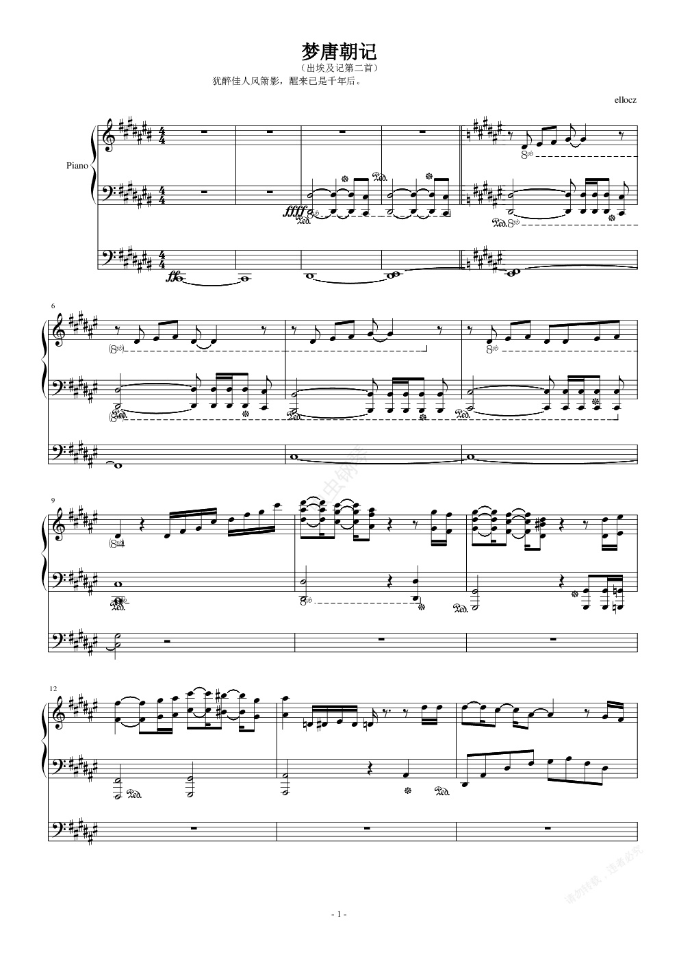 钢琴谱:梦唐朝记(出埃及记第二首)