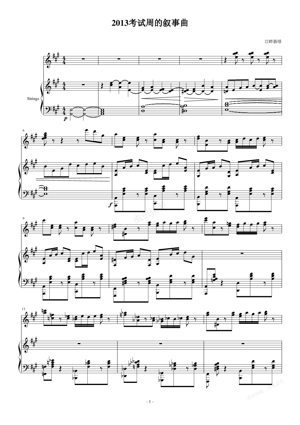 25到58小节:一段小圆舞曲。元旦后的几天下了点雪,雪花纷飞的天空甚是安详和唯美,以此圆舞曲描写漫天纷飞的雪花。