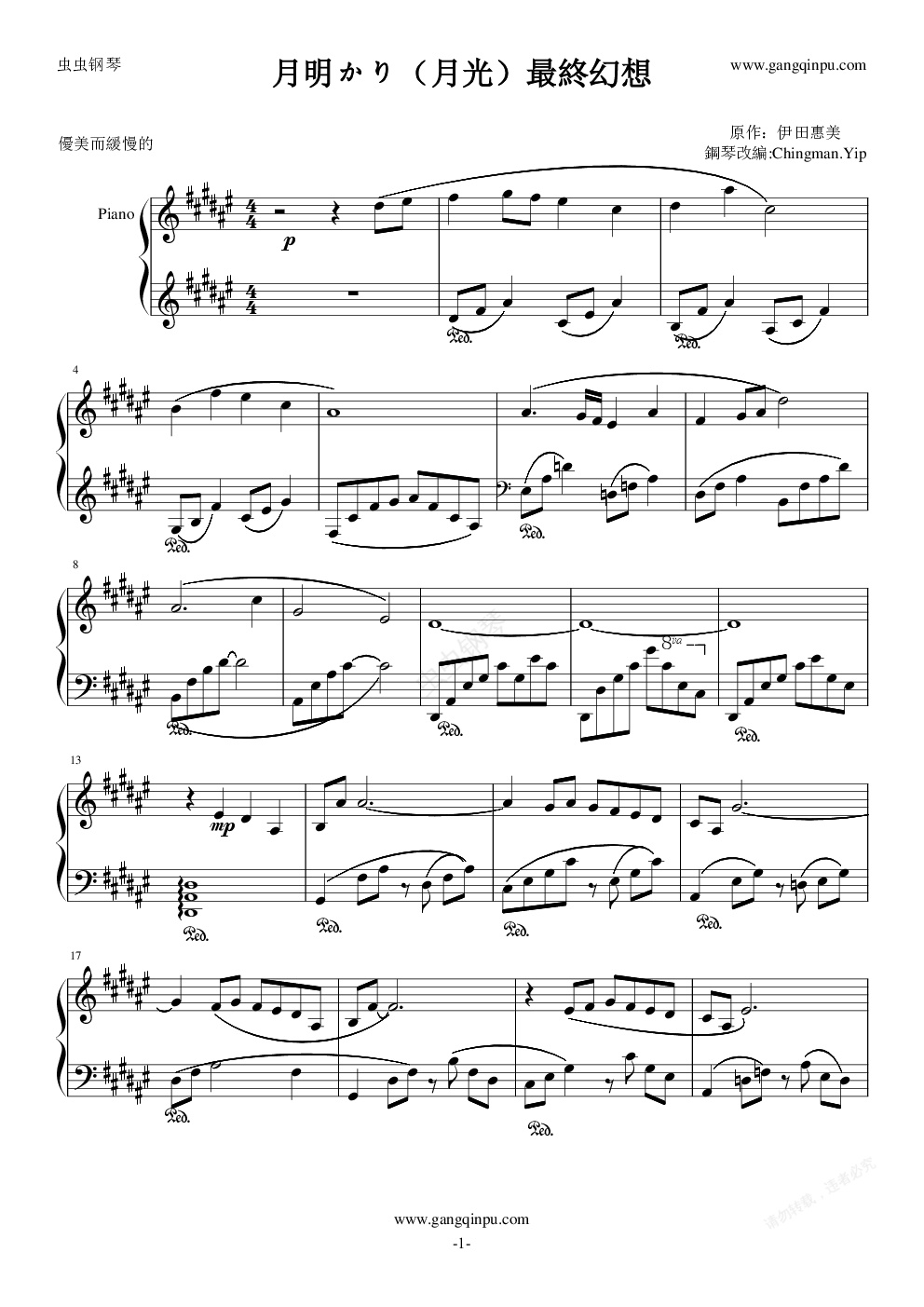 可能大家喜歡最終幻想的都知道【月明かり(月光)】這首歌。原作是伊田惠美。從小我就對這首曲子百聽不厭。小時候只會自己跟著歌曲的旋律,摸索著彈。因為小時候不懂得寫譜,囧。最近忙完了修士論文發表,終於有時間把它全都寫了下來。這是我的原創鋼琴版。可能還是有很多不足,請大家多多指教哈。喜歡的人,就去練練吧。很好聽的鋼琴曲哦~!