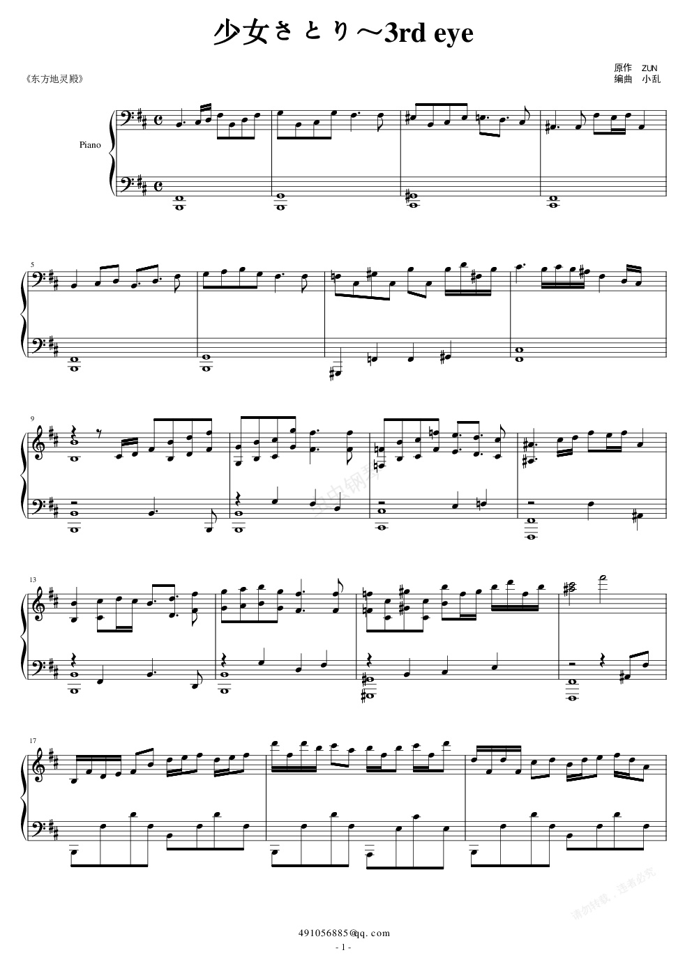 钢琴谱:【东方】少女さとり~3rd eye