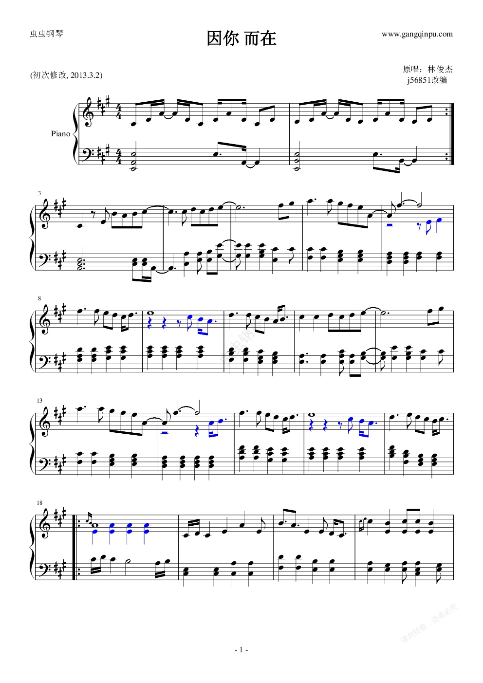 钢琴谱:《因你而在》完整版钢琴独奏谱(第一次修改版)