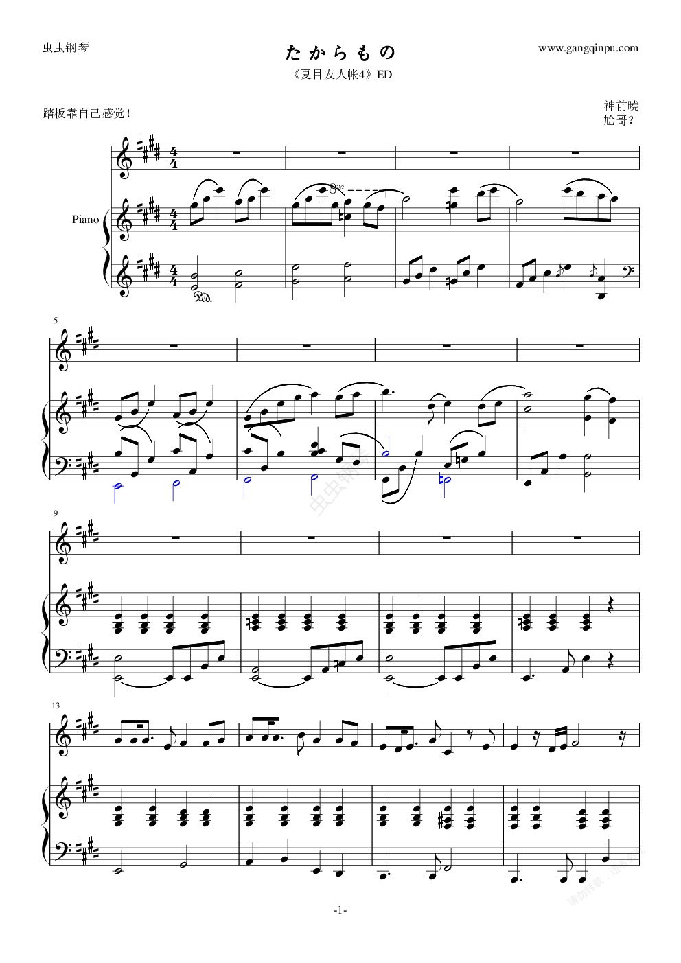 钢琴谱:《たからもの 》:夏目友人帐4 ED