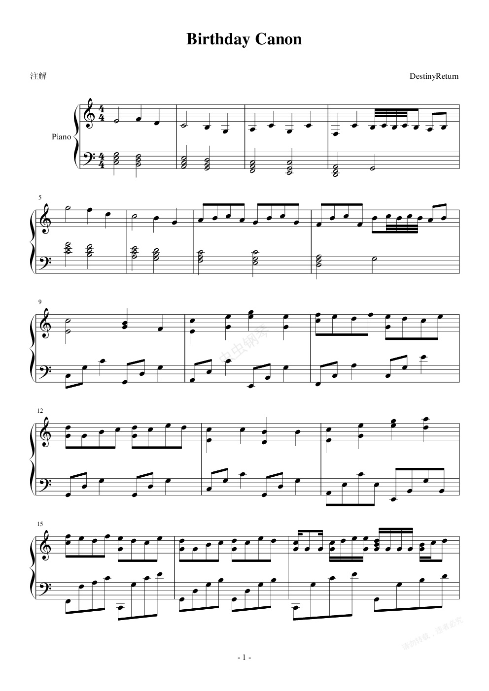 钢琴谱:Birthday Canon
