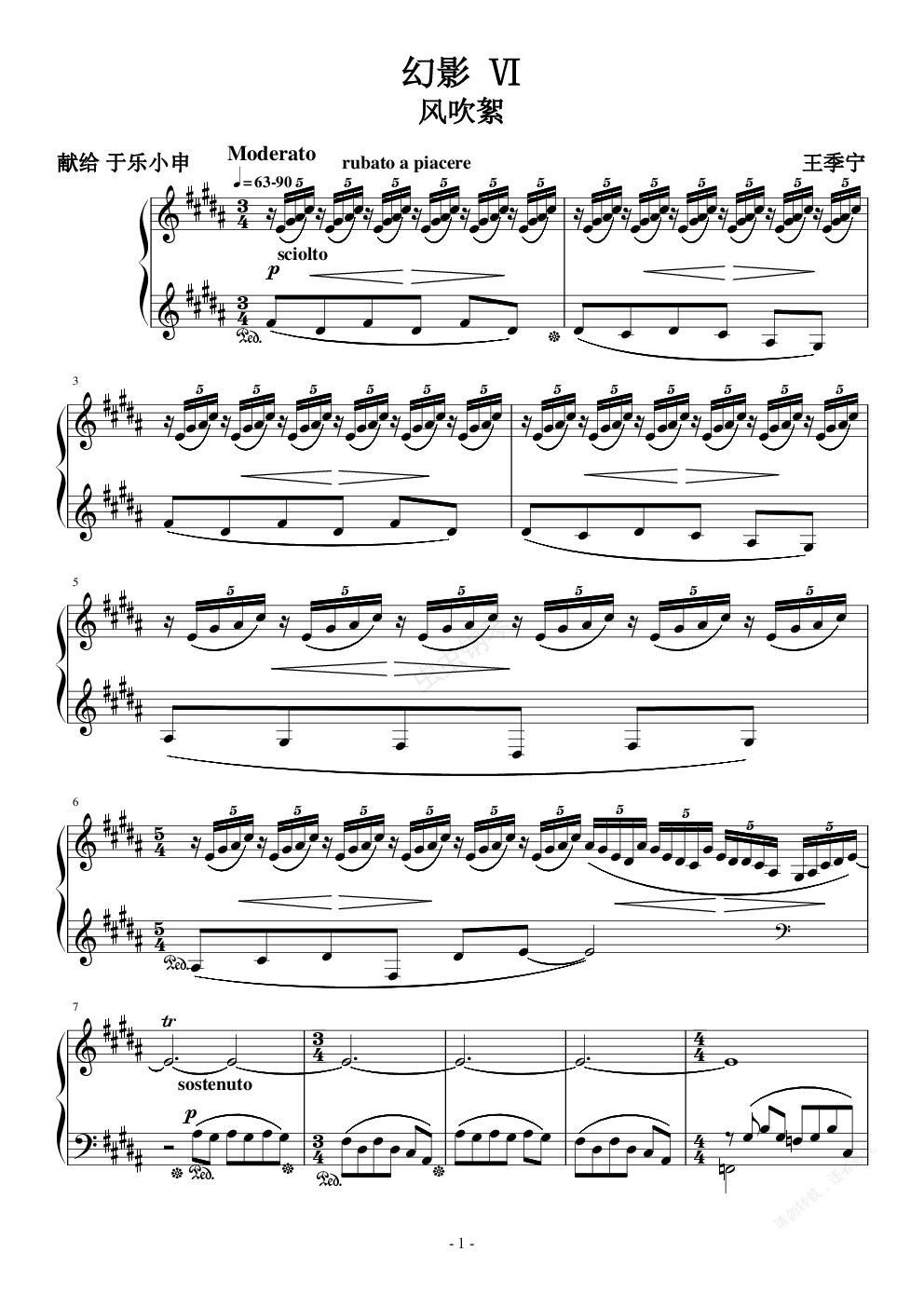《幻影》第六章 献给 于乐小申 作为21岁生日礼物。 清风吹临,拂柳飘絮 洁白掠影,缀入溪荫 步入清静,私丝密语 踏寻无觅,如梦似影 作品风格有点像《蝴蝶》与《繁星色月光湖》,同样节奏与速度的处理随意性较强,旋律变化不多,但演奏一定要轻盈,按键如行云流水,作品上的强弱速度标识仅供参考,但主旋律尽量做到每小节都先渐快后渐慢,衔接部分无太多要求。