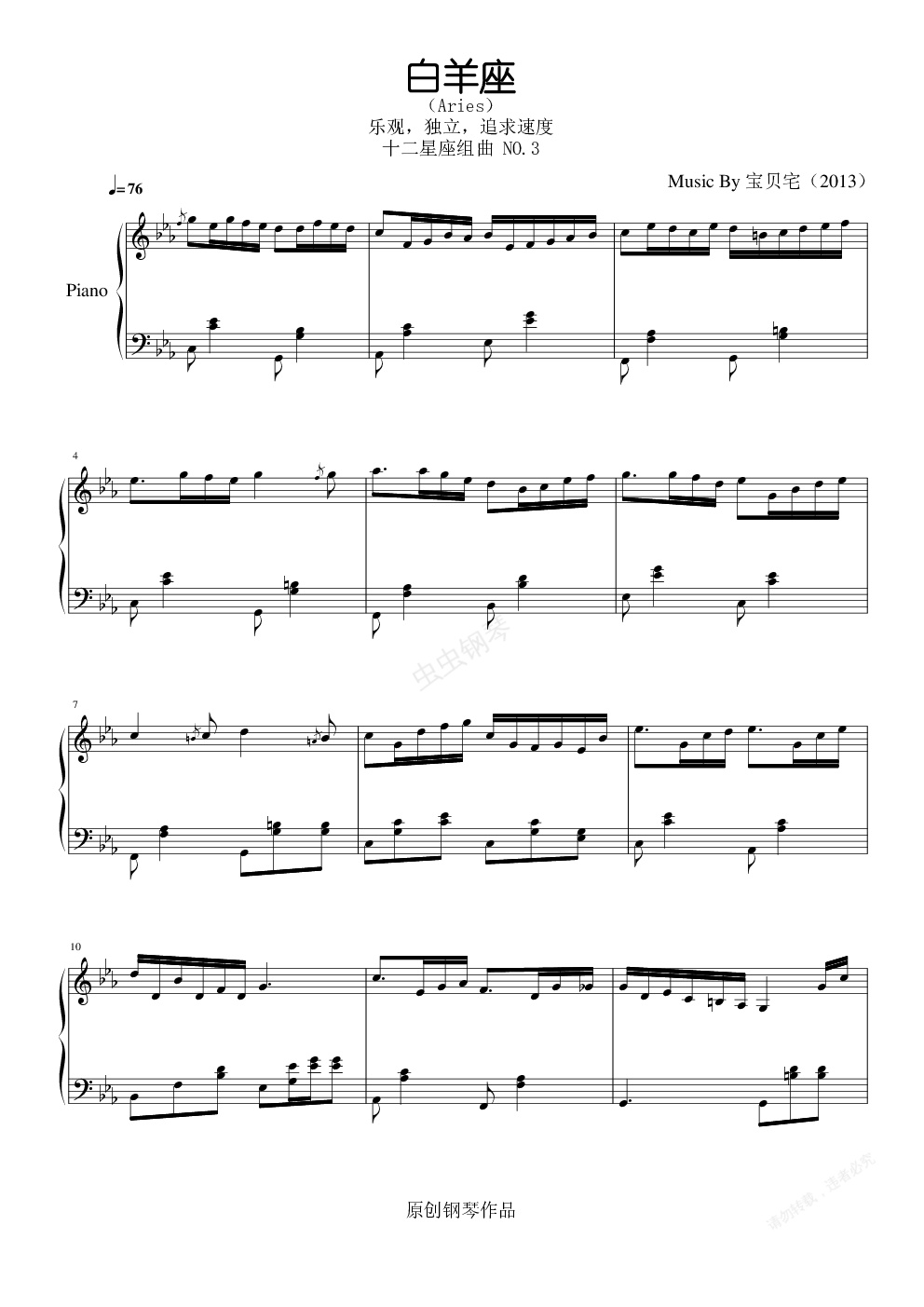 十二星座钢琴组曲之三。按星座的日期顺序排行分别上传~白羊座的朋友都天生不羁,活泼独立,所以就按这种感觉写这首带有跳跃感速度感的曲子。