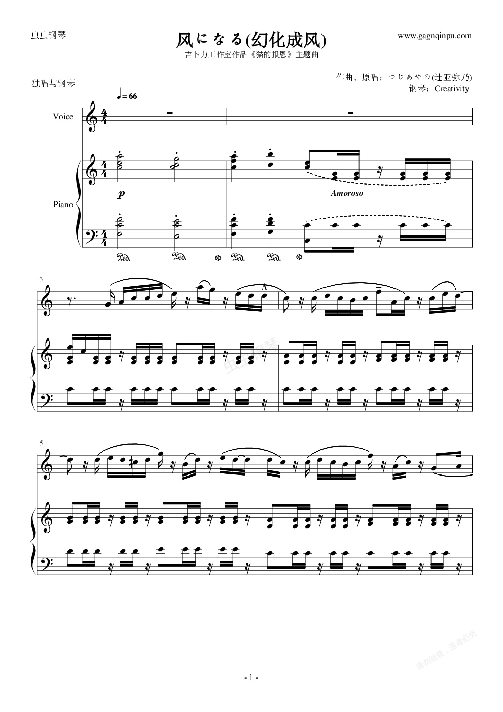 钢琴谱:钢琴伴奏: 风になる(幻化成风)