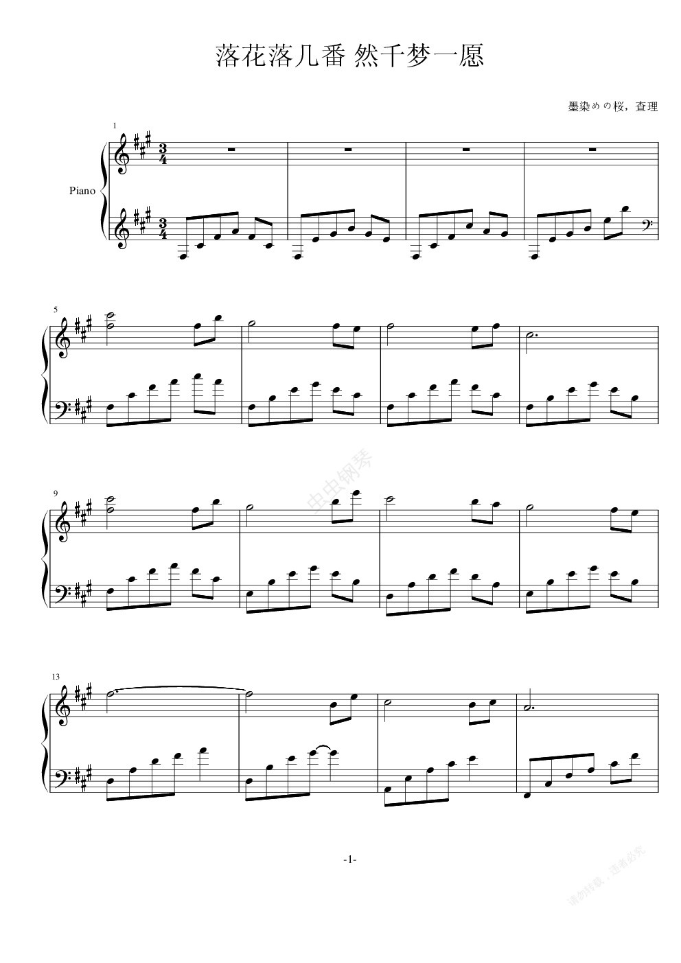 钢琴谱:落花落几番 然千梦一愿