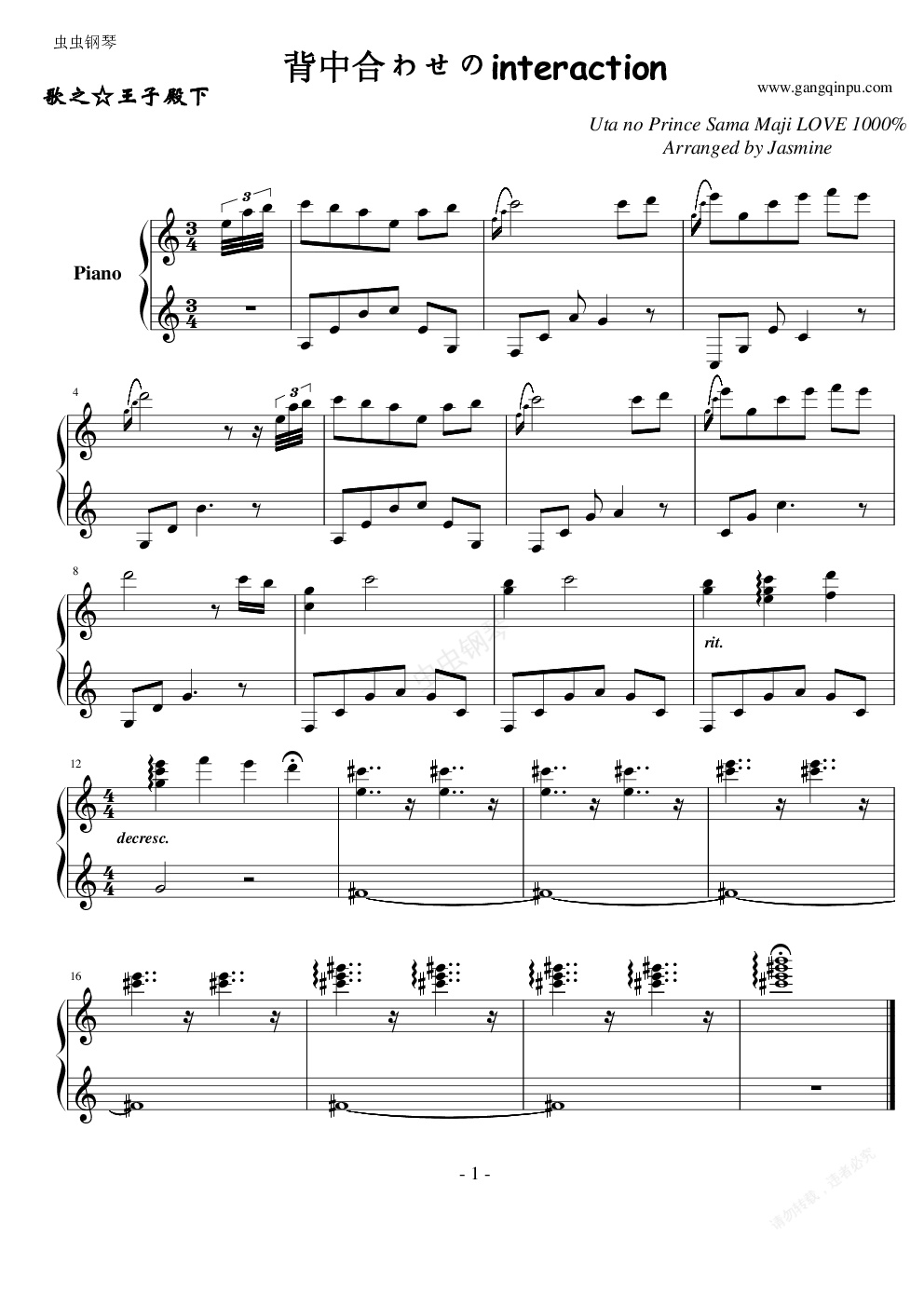 钢琴谱:【歌之王子殿下】背中合わせのinteraction