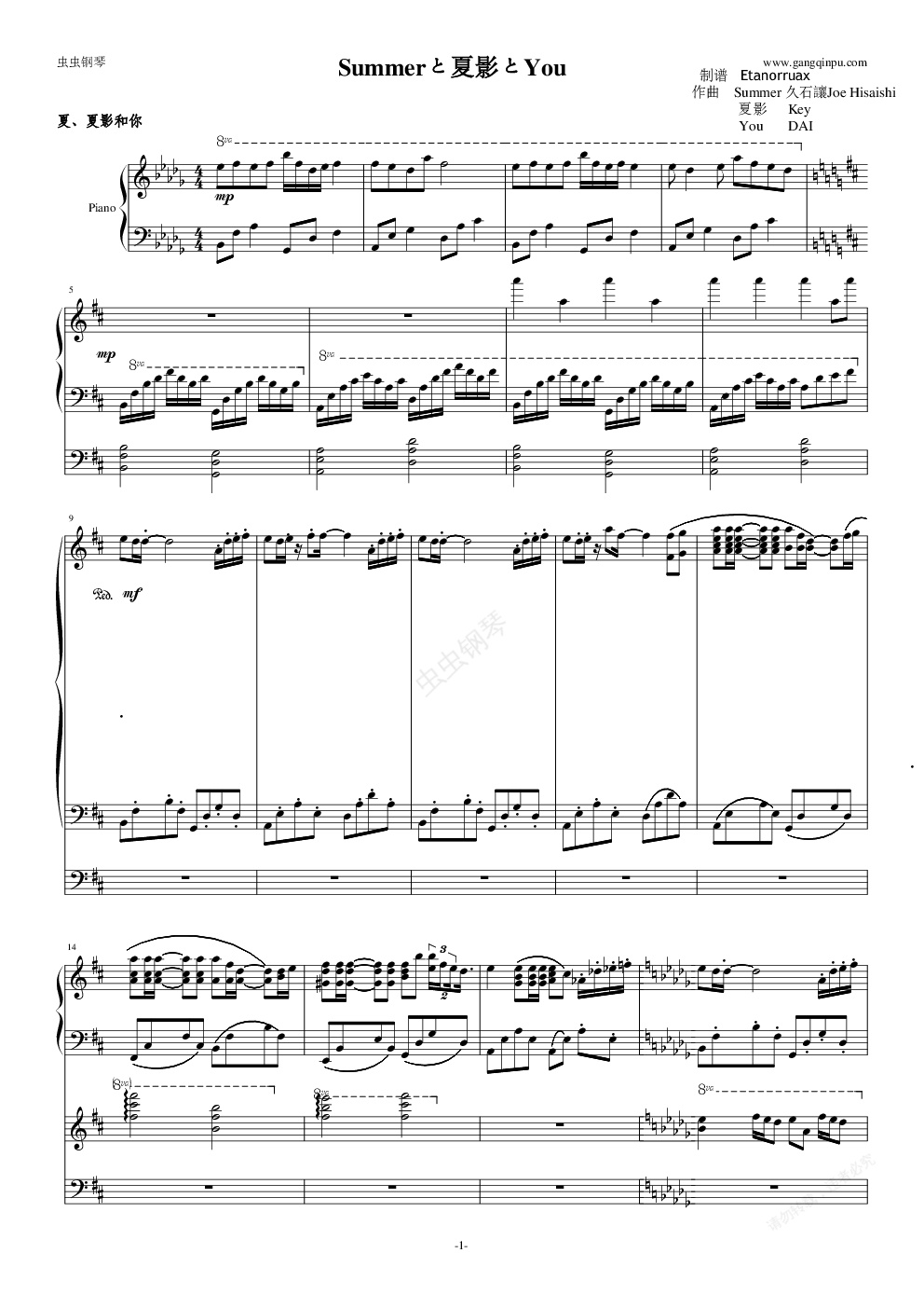 钢琴谱:Summerと夏影とYou 连奏 四手连弹
