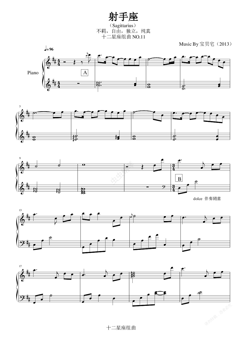 十二星座钢琴组曲之十一。射手座一直给人自由不羁的形象,天生活泼开朗,是很让人喜欢的星座。我女朋友就是射手座的,虽然大大咧咧的,但对我还算温柔,如果不吵架的话。这首曲用如歌般的旋律来描写射手座,节拍变化了几次,旋律多次重复,通过自由的伴奏来表现。 P.S:谢谢大家的支持,星座组曲只是我个人的想法感受,不能满足每位朋友的想法,还请见谅~如果没引起各位的共鸣,把它们当成纯音乐欣赏就可以了~