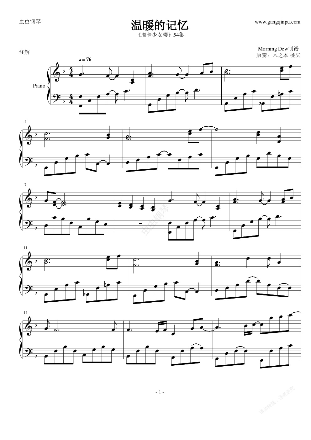 钢琴谱:温暖的记忆(魔卡少女樱钢琴曲)