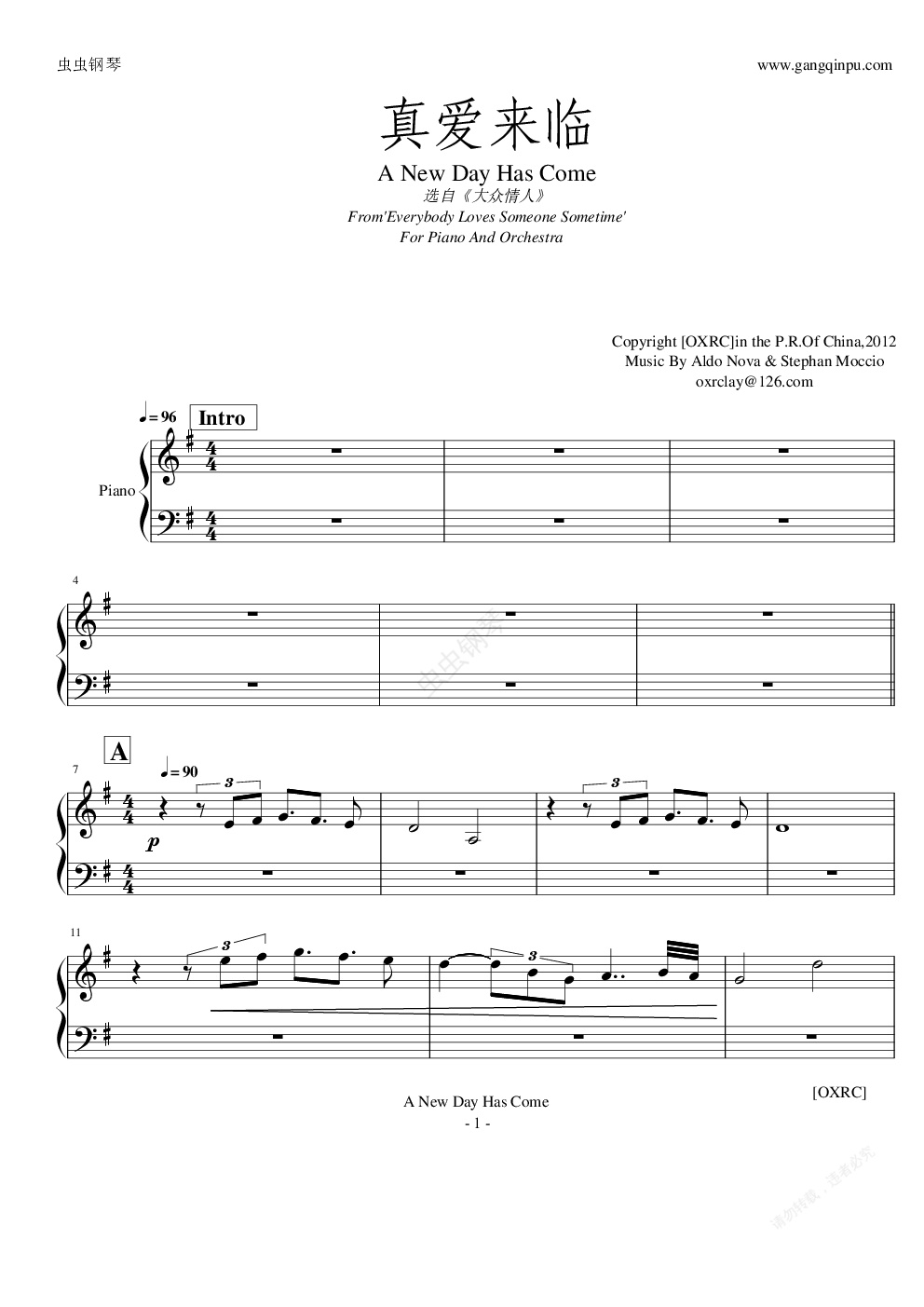 钢琴谱:[OXRC] A New Day Has Come 真爱来临