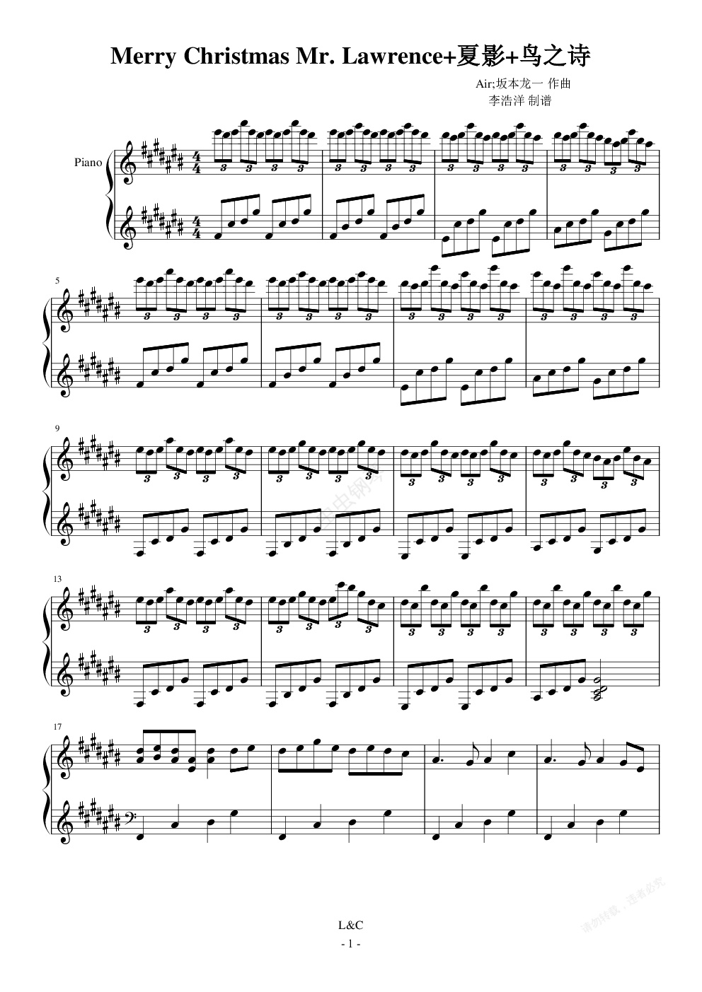 钢琴谱:Merry Christmas Mr. Lawrence夏影鸟之诗