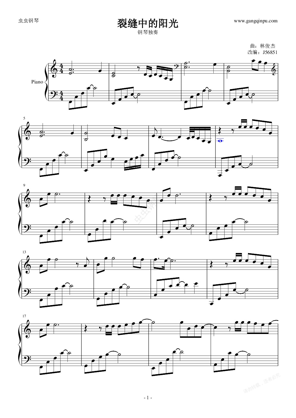 钢琴谱:JJ Lin 林俊杰 《裂缝中的阳光》 钢琴独奏