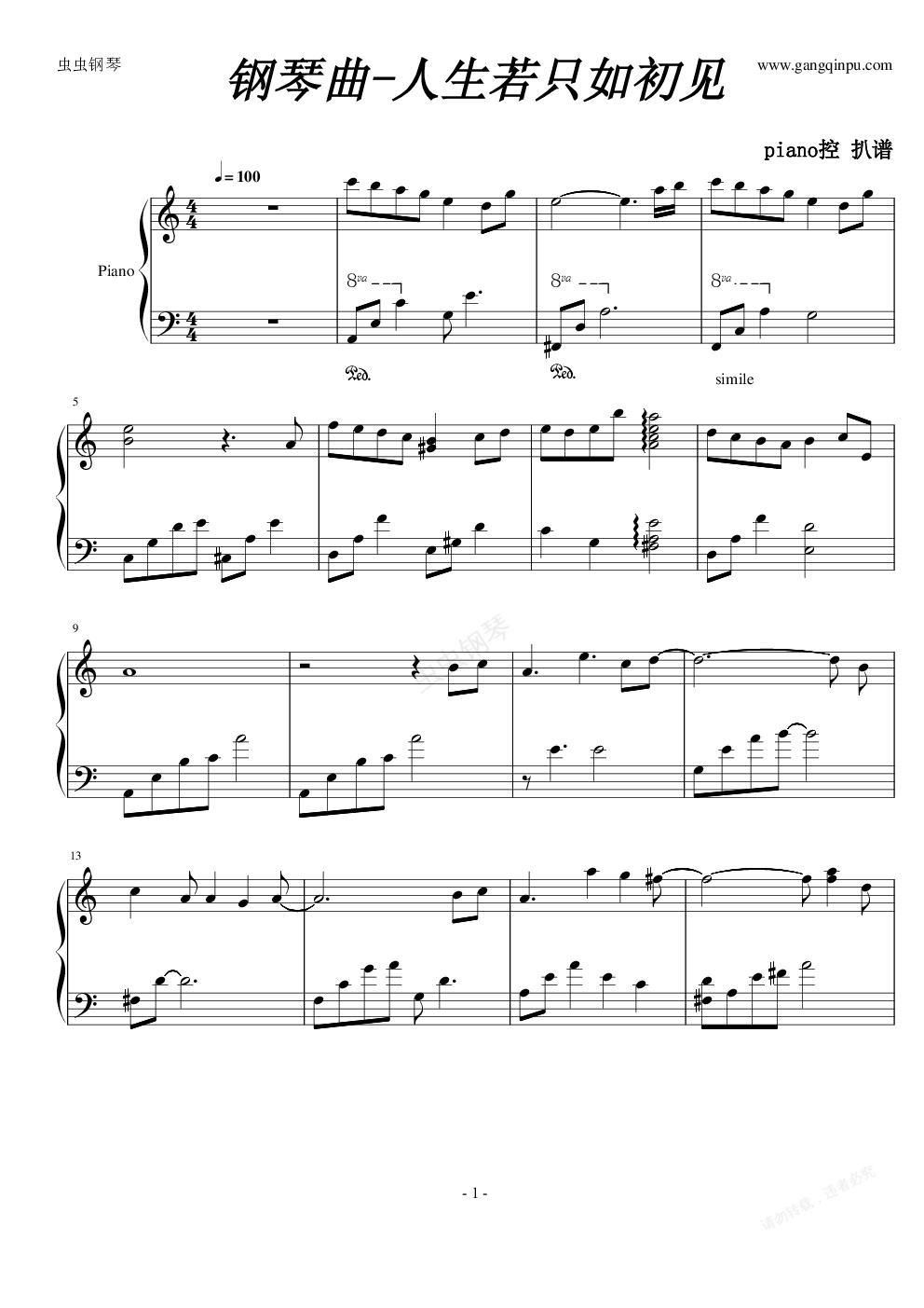 钢琴谱:人生若只如初见