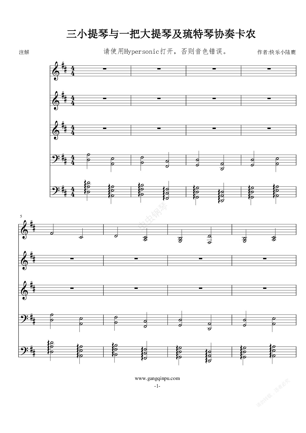 钢琴谱:三把小提琴与一把大提琴及琉特琴协奏卡农