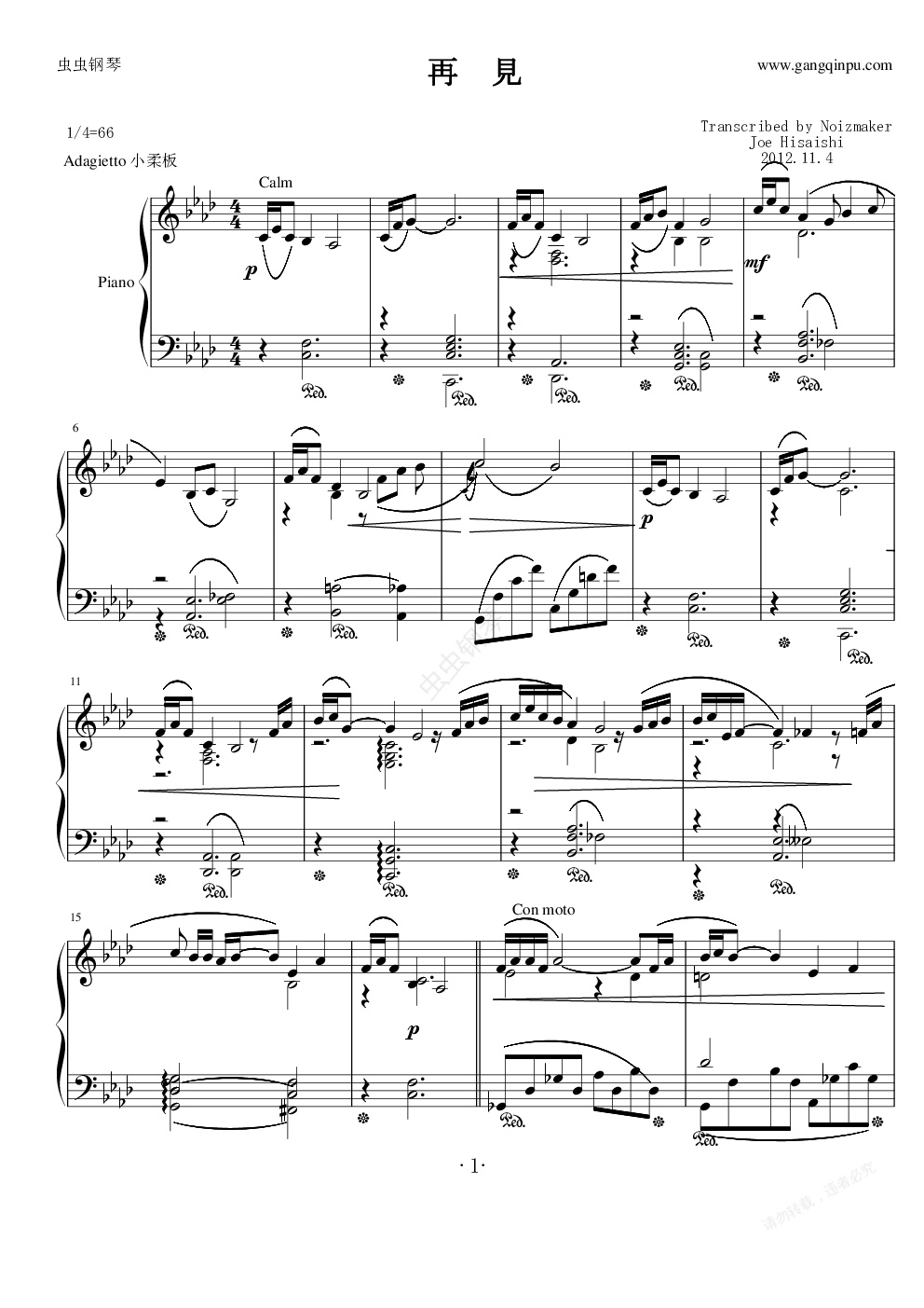 钢琴谱:再见(久石让asian X.T.C中作品)