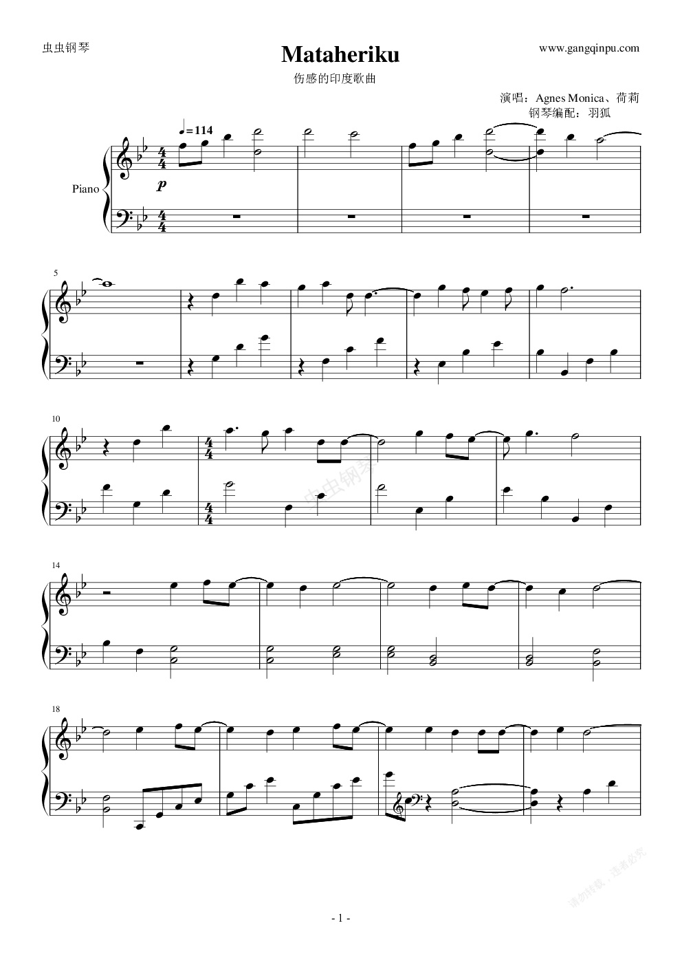 钢琴谱:Agnes Monica、荷莉 -Matahariku(印度伤感歌曲)
