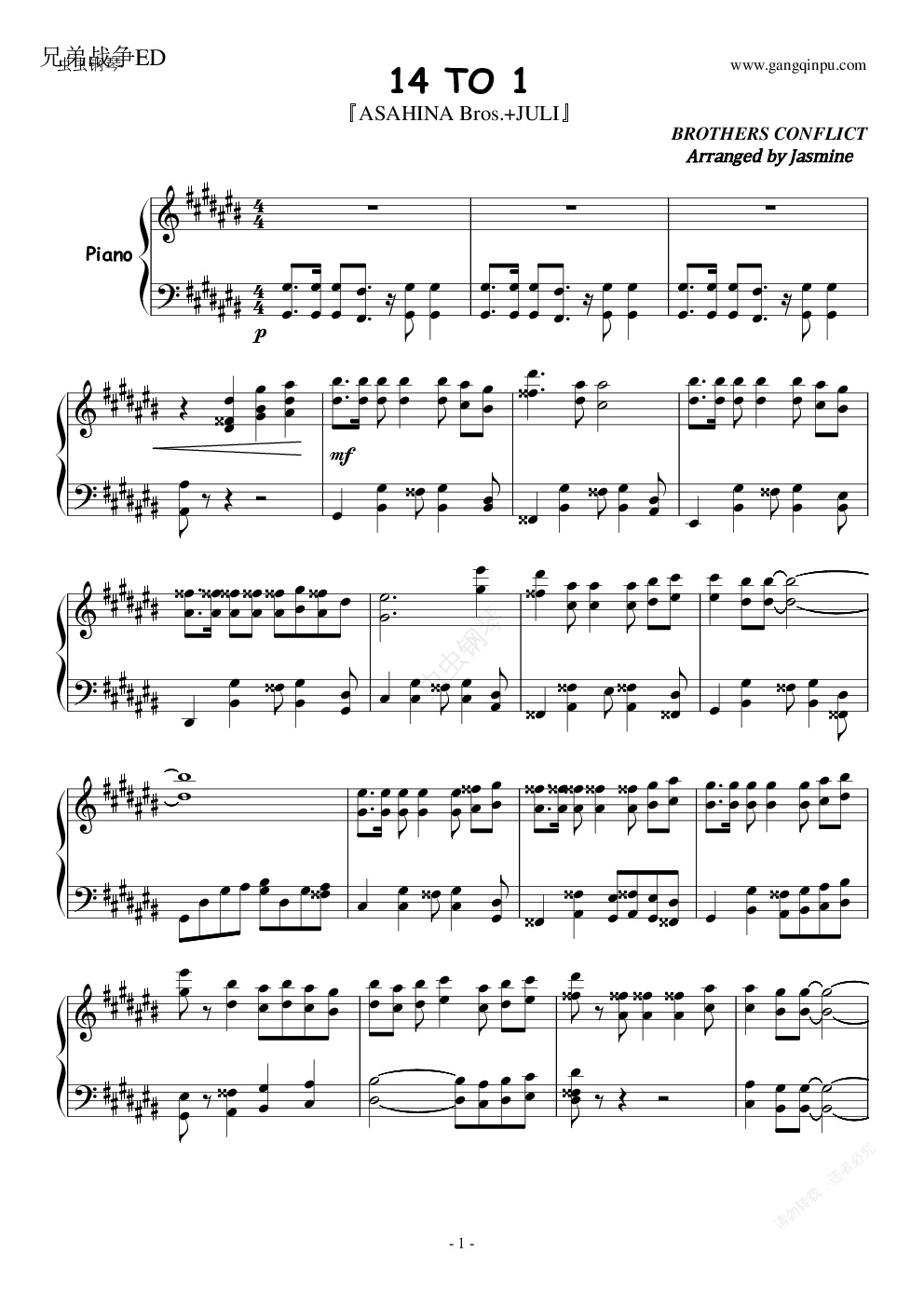 钢琴谱:【兄弟战争】14 TO 1