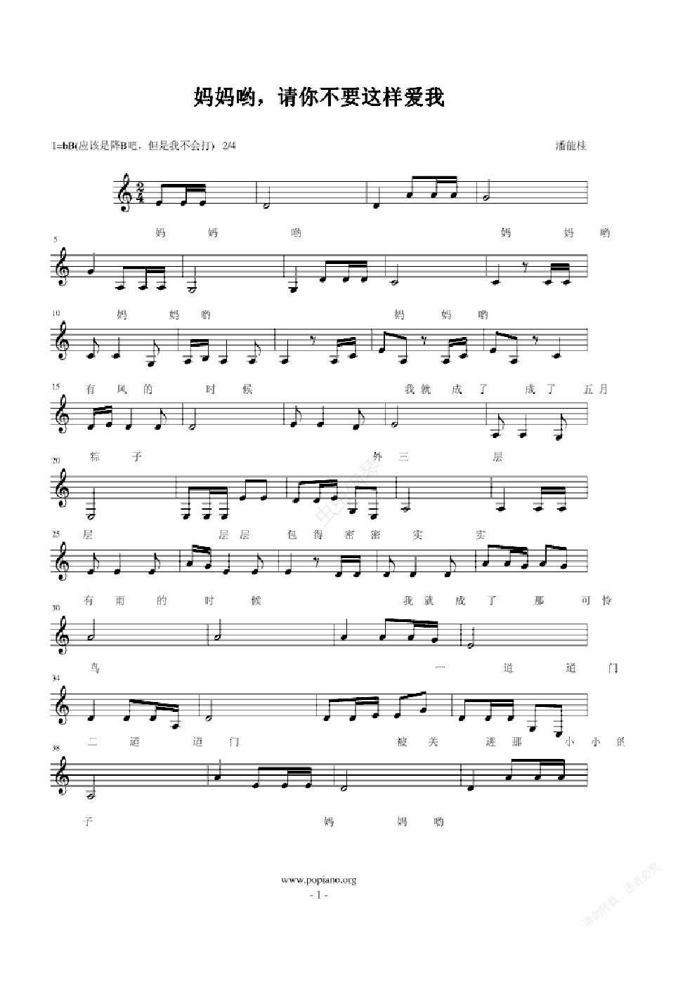 钢琴谱:妈妈哟,请不要这样爱我