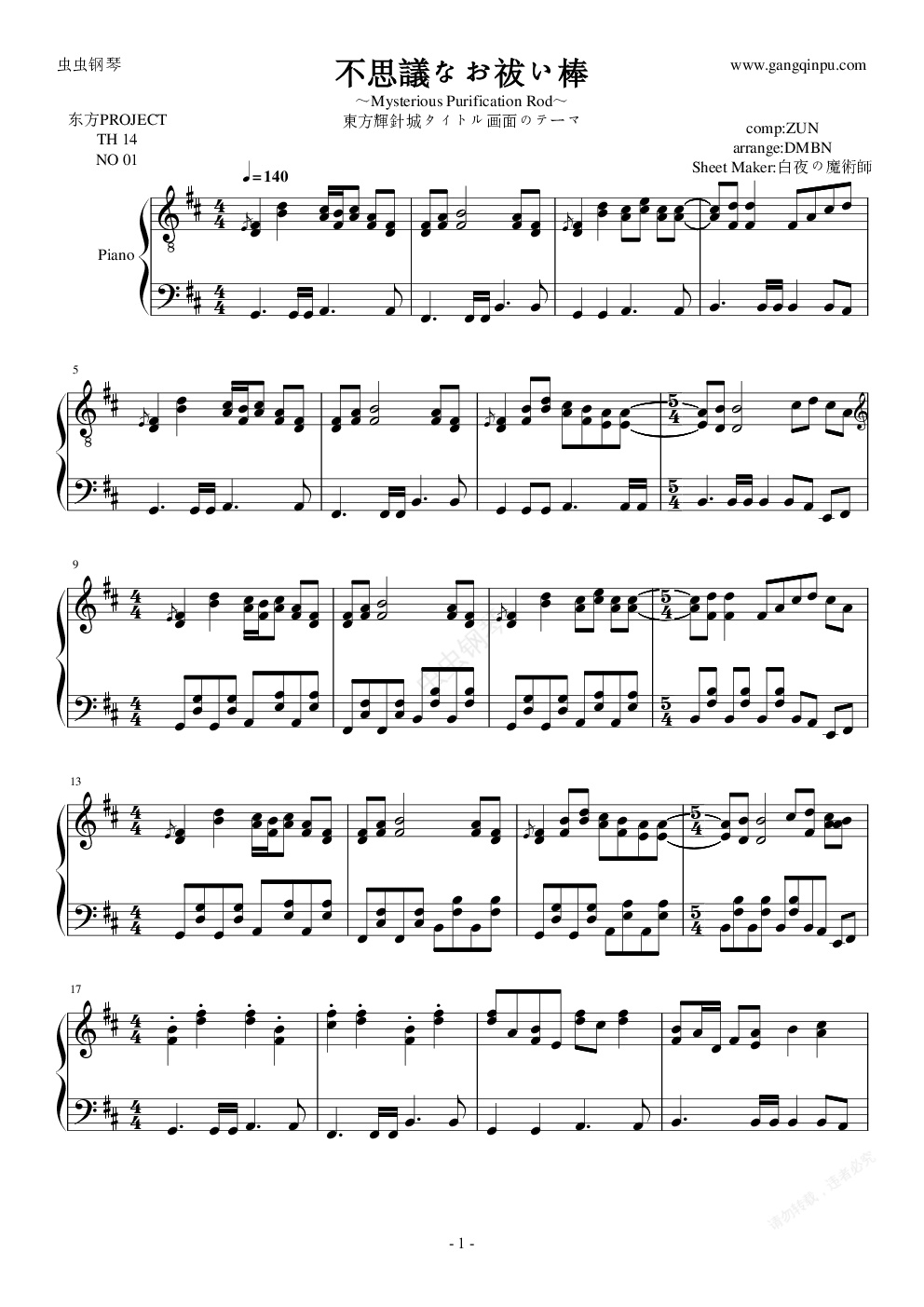 钢琴谱:【东方辉针城】不可思议的驱魔棒