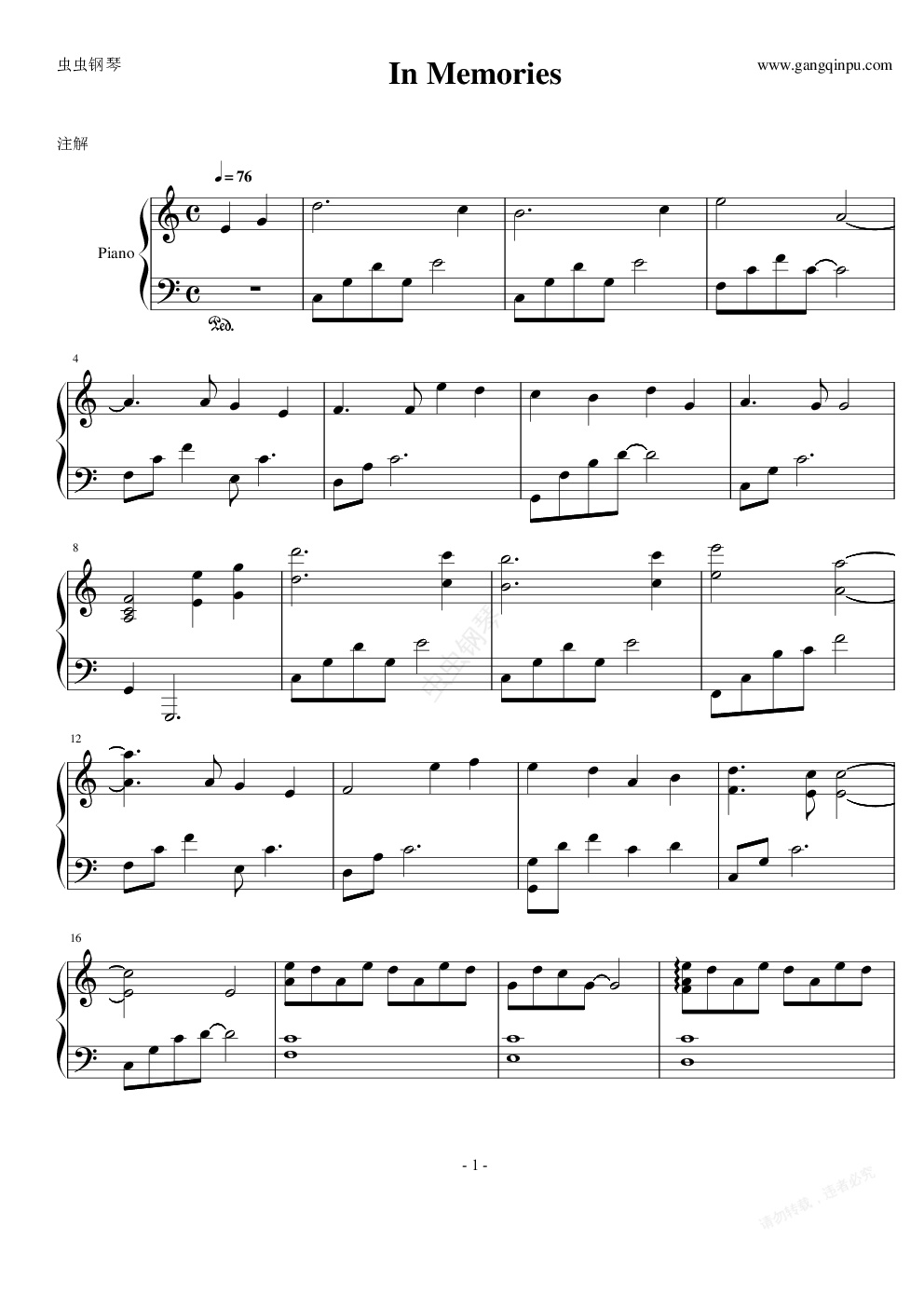 钢琴谱:In Memories - 主君的太阳 OST