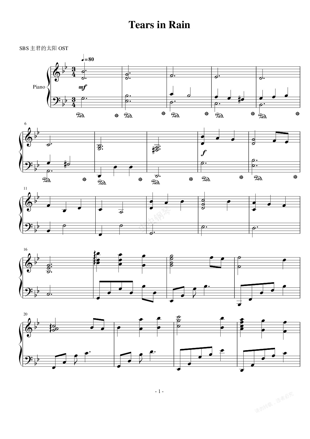 钢琴谱:Tears In Rain - 主君的太阳 OST