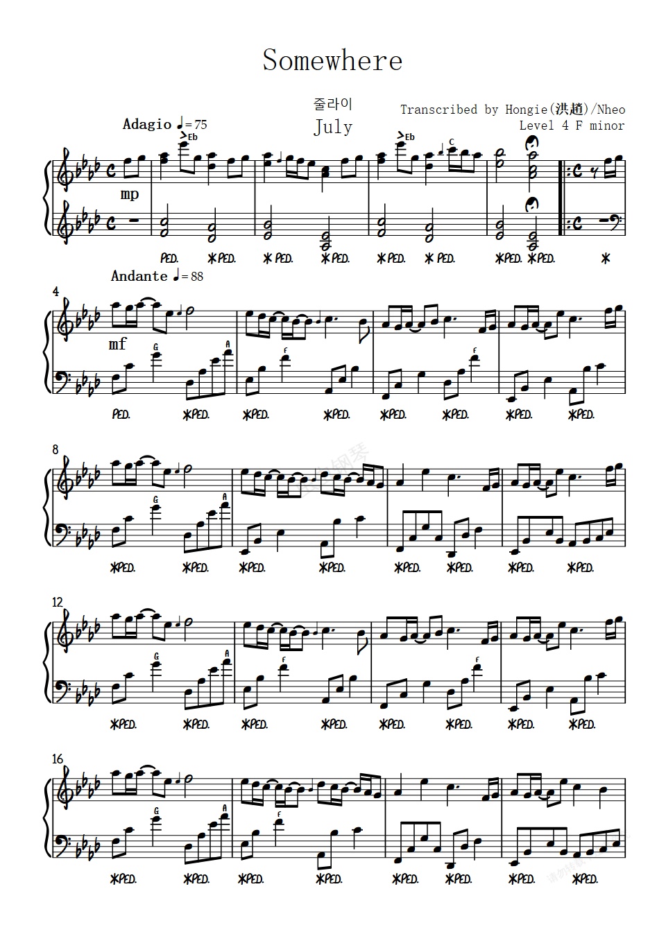 钢琴谱:Somewhere