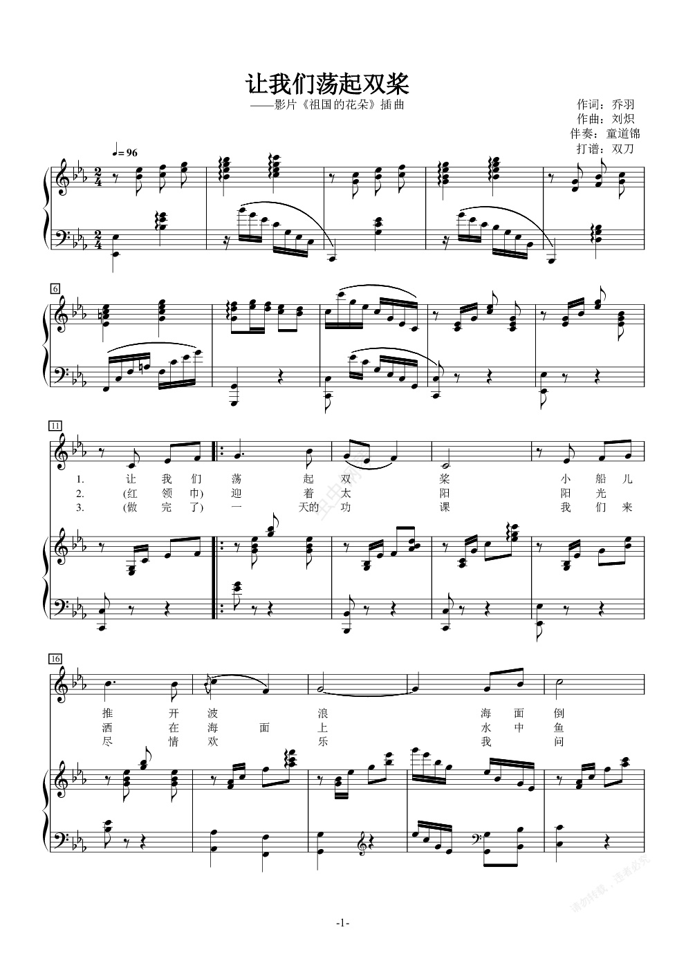 钢琴谱:让我们荡起双桨(伴奏谱)