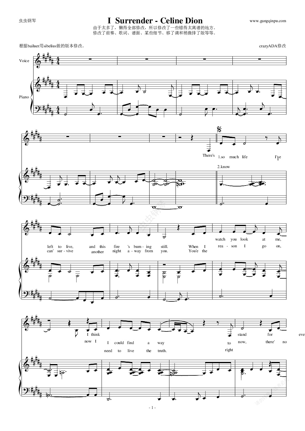 钢琴谱:I Surrender - Celine Dion (没离开过 - 林志炫)