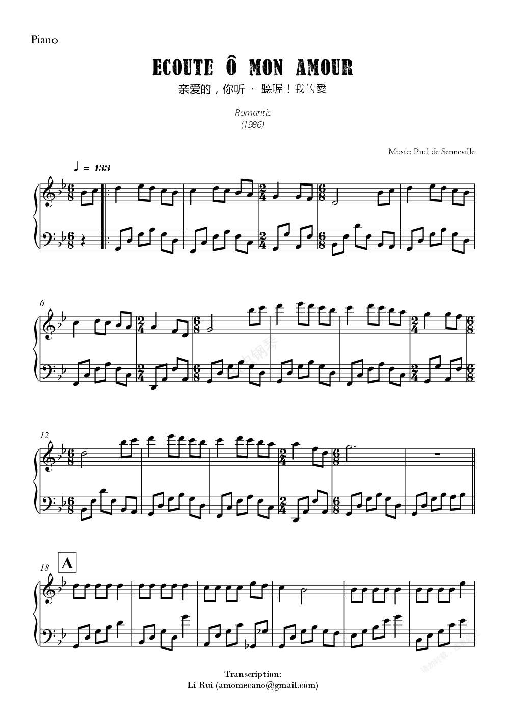 钢琴谱:亲爱的,你听(Ecoute o mon amour)