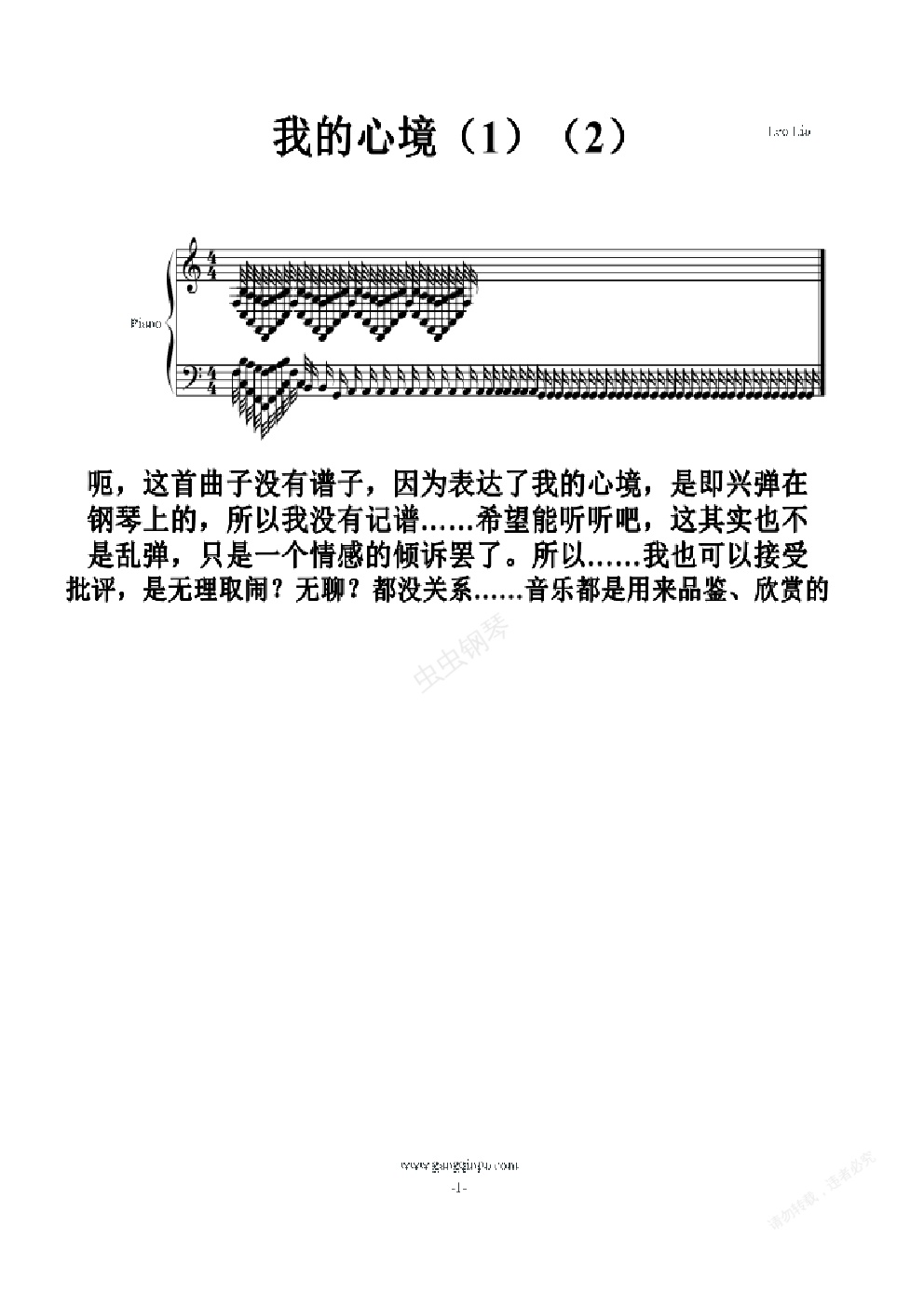 哇哦,我第一次这样搞……好吧,我的确有点精神失常!!!为什么?没错,我感觉有人会说:音乐不是无理取闹!没错,我承认,但是有人想过用音乐来倾诉自己的感情嘛?我这次这样做,也只是想用音乐表达自己的情感。音乐可以有情感、有生命!我就这样尝试了……同时得感谢一下乐师啊,没有他的“心境”说,我也可能不会这样………………………………无聊。。。我说明一下,这个第一首(我也不知道是哪边,总之有九分钟)是较为“狂暴”的,当然也只是开头那几段,这是因为那时我有点愁苦,发泄了一下,基本上有点乱弹……还用了许多的音阶、半音阶……终于在结尾时怨气尽了,就这样轻轻缓缓的结束。第二首(五分钟那首):是最近弹的,这个相对于第一首就有点缓和了,有些地方用了倚音,就是有时候会突然推高,出现一些反差较大的音……好吧,我心情有点不平静...总之弄了这两首无谱的即兴曲,都是没什么形式的………………多批评啊!