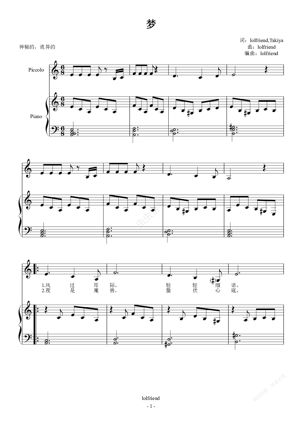 描述了思念旧情人而做的噩梦,谢谢同事写的精彩诗词,激发了灵感。刚学了一点和弦理论,深感中间高潮部分的和弦编配不够好,有待进一步完善。上传后歌词看不清了,附上歌词: